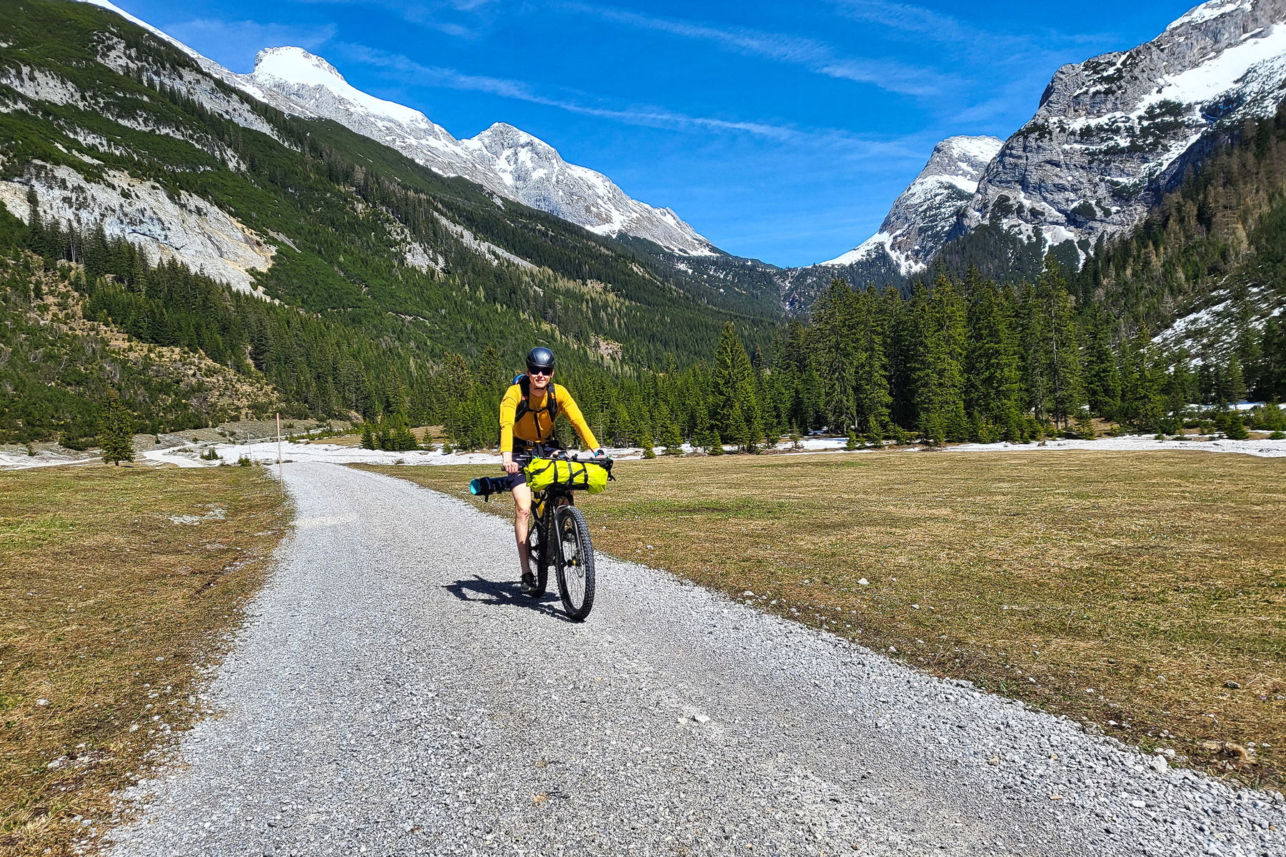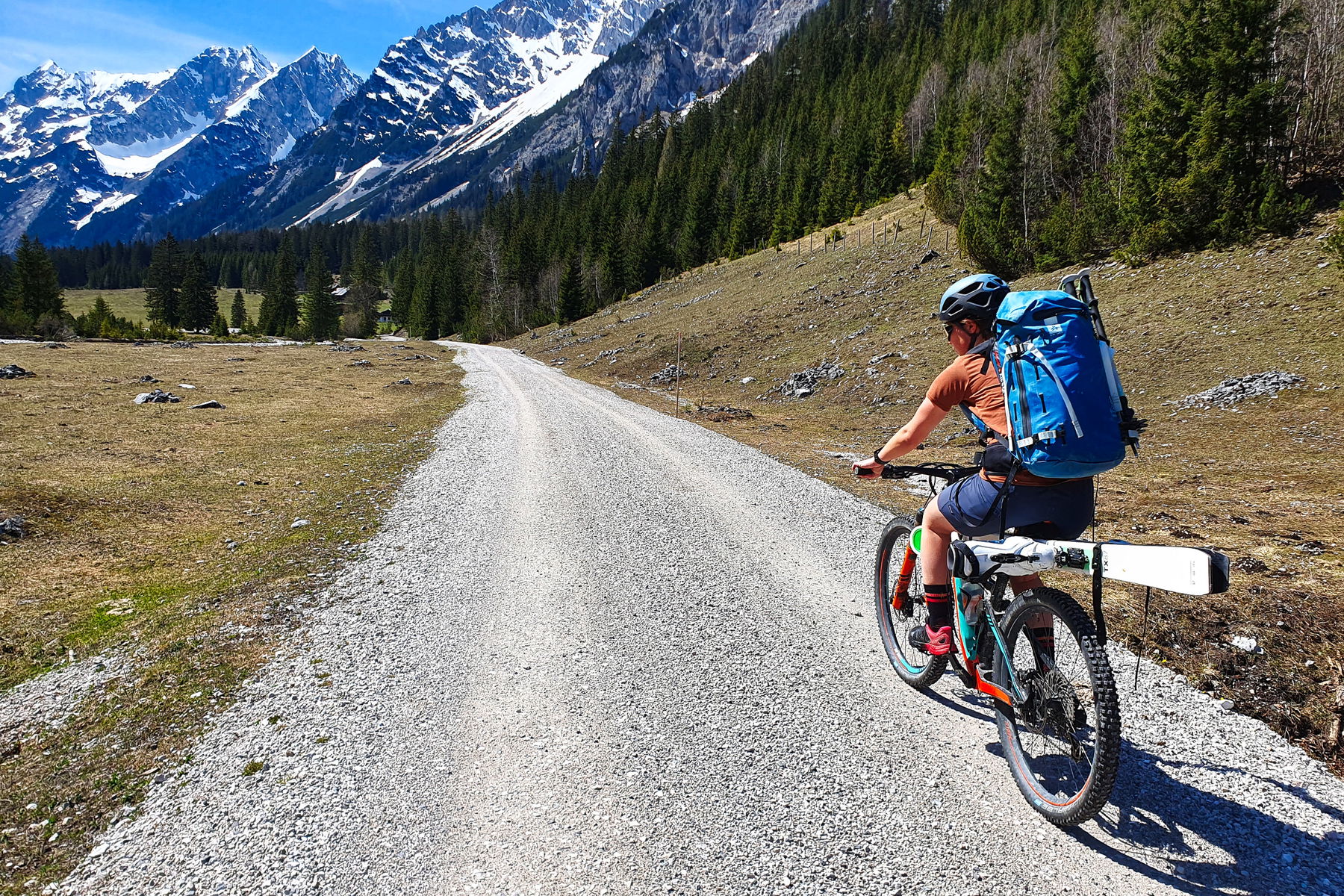 Die Täler im Karwendelmassiv sind lang, sehr lang. Dafür großteils angenehm flach, was sie für MTB-Touren auszeichnet. Die Forststraßen sind Anfang Mai, als wir die Tour gehen, schon längst aper, die MTB-Saison hat für andere schon begonnen, ehe für uns die Skitourensaison vorbei ist. Noch können wir uns von unseren “Bretteln” nicht trennen, sie weit hinauf am Rucksack befestigt zu tragen, überzeugt uns jedoch nur in Ausnahmefällen. Stattdessen wollen wir den schneefreien Teil mit dem MTB überwinden.