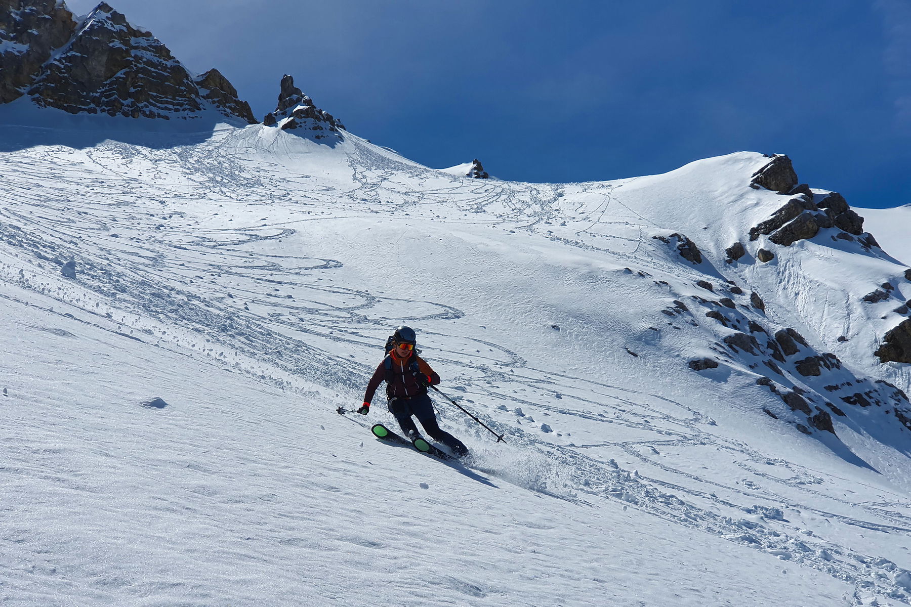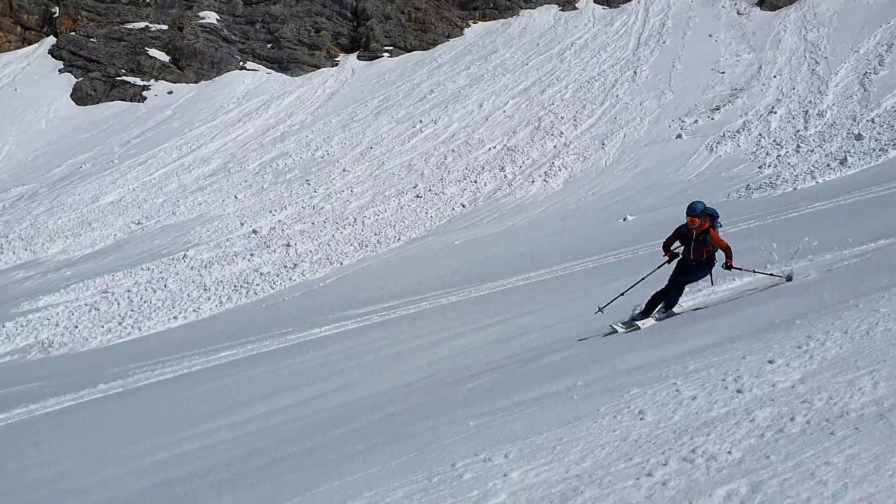 Wir nehmen gleich die direkte Einfahrt vom Biwak ins Schlauchkar. Der erste steile Hang ist wahrlich kein Abfahrtsgenuss, aber mit ein bisschen Gespür für die Hangausrichtungen finden wir im unteren Teil schon den ersten Firn des Tages.