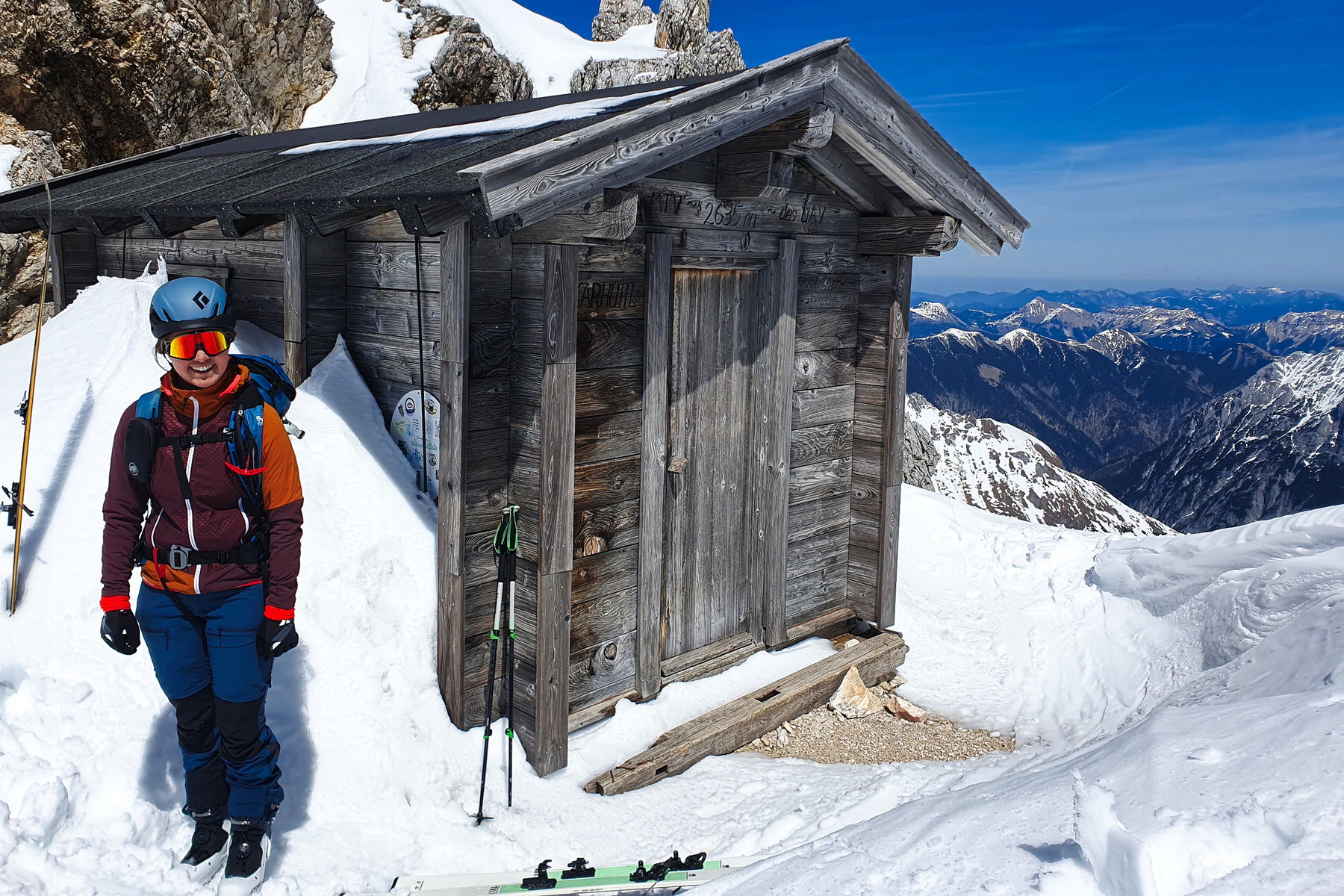 Auch wenn die Aussicht vom mit 2749m höchsten Gipfel des Karwendels wunderschön ist, halten wir die Gipfelrast kurz, um auch bei der Abfahrt noch gute Schneeverhältnisse vorzufinden. Also begeben wir uns rasch zurück zum Skidepot und adjustieren uns für die Abfahrt.