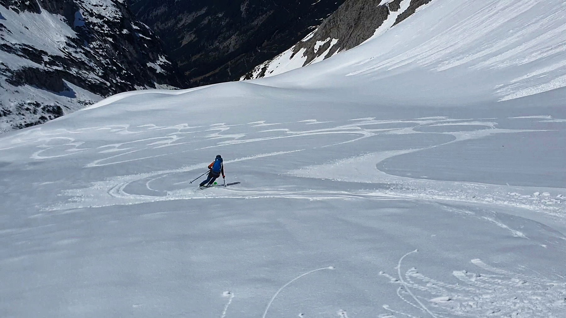Ab jetzt sollte der Schnee immer besser werden. Erfreulicherweise bewahrheitet sich unsere Einschätzung und so finden wir im unteren Teil des Schlauchkars beste Firnverhältnisse vor. Die Abfahrt in diesem Bereich ist einfach nur zum Genießen.