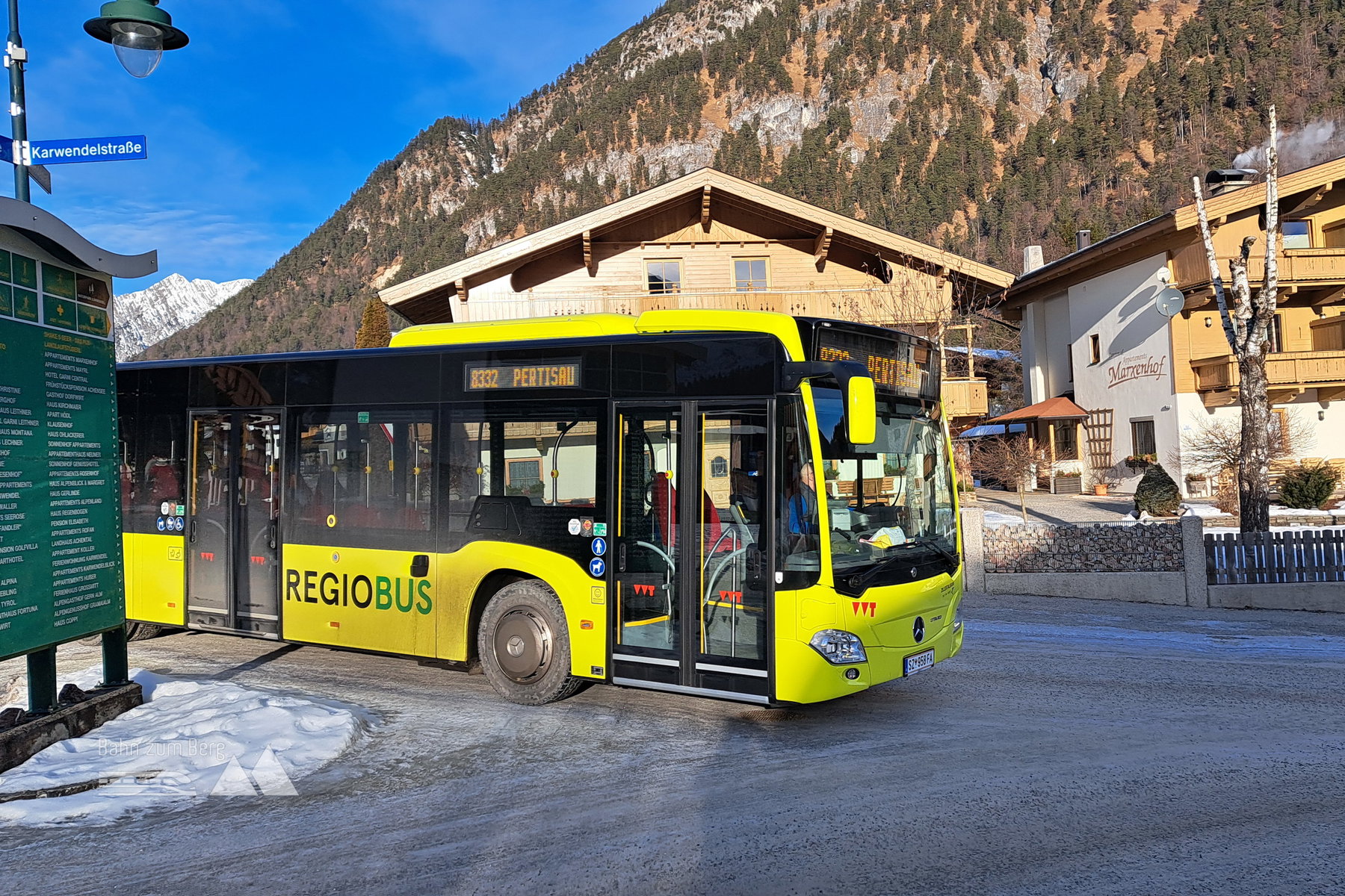 Vom Bahnhof Jenbach fährt stündlich ein Bus über die Mittelschule Maurach – oft muss man hier in den gut gefüllten Bus nach Pertisau einsteigen – ich habe aber bisher immer noch einen Sitzplatz ergattert. Vorbei am wunderschönen Achensee komme ich zum Marxenhof, wo ich eine Gästekarte zur kostenlosen Loipenbenützung bekomme.