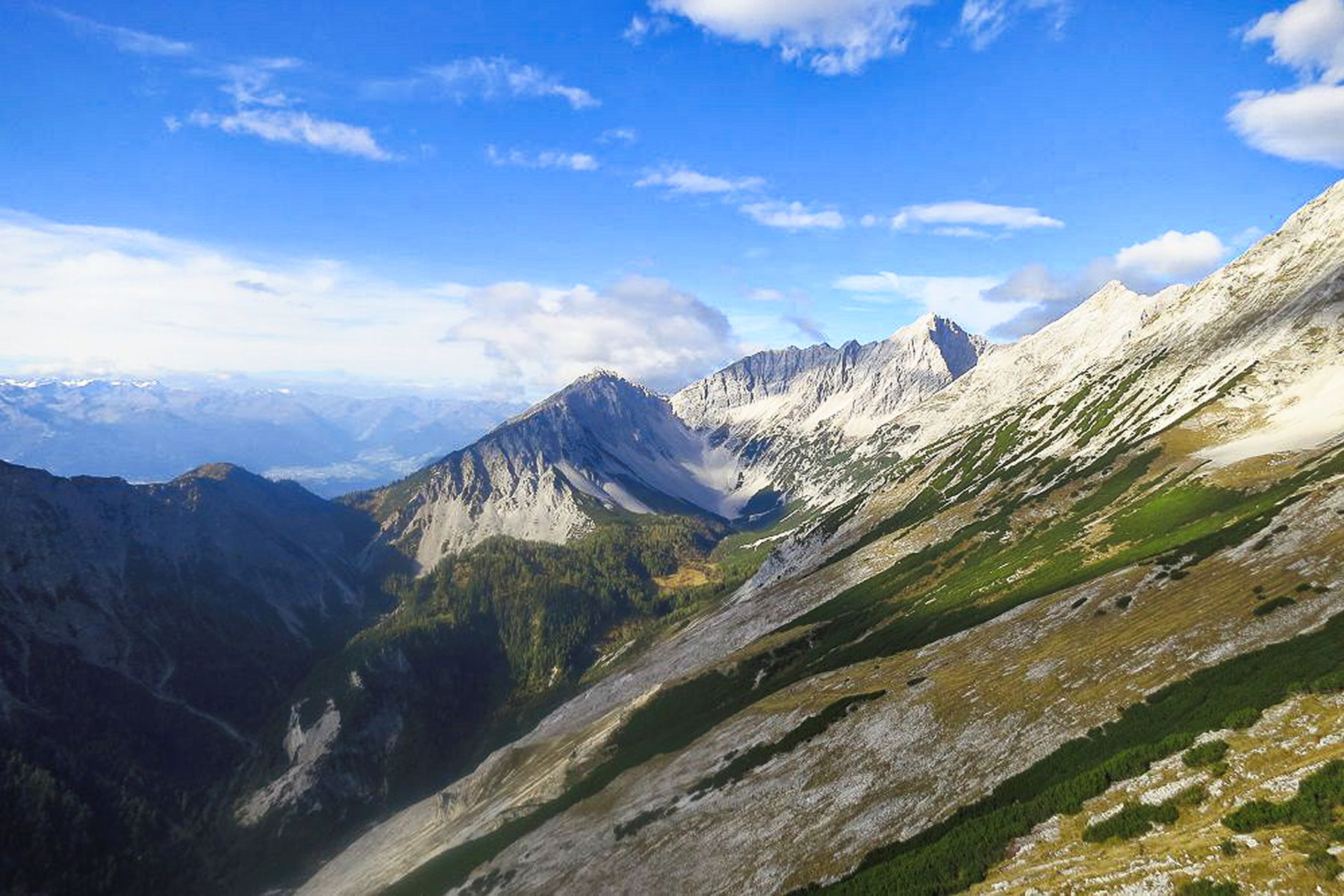 Von der Hütte aus können wir einen Großteil des heutigen Routenverlaufs überblicken: die zwei vom Gletscher abgerundeten Gipfel direkt im Süden auf der anderen Halltal-Seite werden wir in einem großen Bogen von Westen kommend überschreiten, um zum Ausgangspunkt zurückzukehren. Zunächst folgen wir dem Wanderweg 222 weiter nach Westen zum Lafatscher Joch, welches wir nach einigem Bergauf und Bergab erreichen. Von diesem breiten Rücken steigen wir nun linkerhand zum Issanger (1626 Meter) beziehungsweise Richtung St. Magdalena ab.