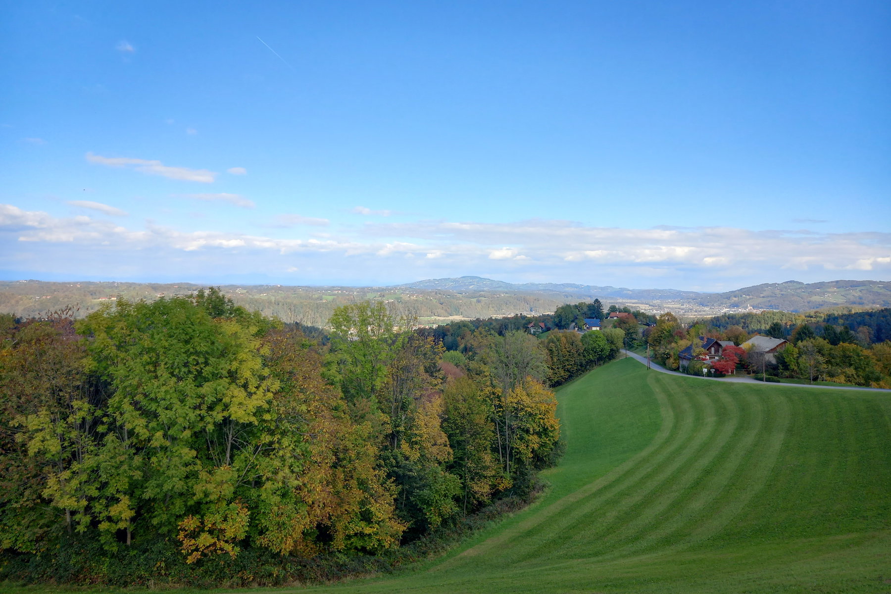 Nur 500 Meter nach dem Klammaussteig taucht die Panoramaschenke Tertinek auf, die  ihrem Namen alle Ehre macht. Vom Aussichtsplateau vor dem Buschenschank genieße ich die südsteirische Postkartenidylle. Der 180-Grad-Panoramablick reicht von der Koralm über die Gleinalm bis ins südoststeirische Vulkanland und an klaren Tagen sogar bis zum Hochschwab.