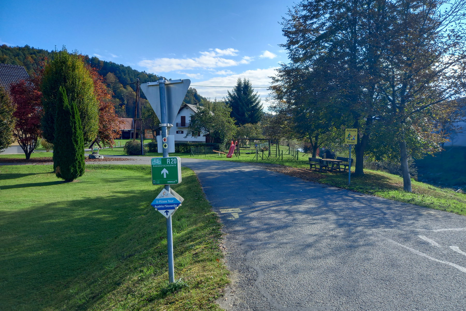 Gestartet bin ich beim Bahnhof in Pölfing-Brunn, wohin mich die S6 praktischerweise direkt von meinem Heimatbahnhof in Puntigam gebracht hat.  Die ersten Kilometer rollen leicht dahin – perfekte Bedingungen, um mich langsam warmzufahren. Kurz nach dem Ortsende wartet ein kurzer, etwas steilerer Anstieg, bevor es den Tombachgraben hinunter nach Bischofegg geht. Hier folge ich ein Stück dem Saggautalradweg (R20), der mich über Udelsdorf nach Oberhaag bringt.