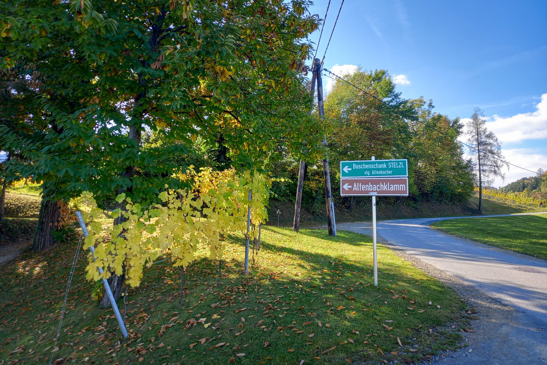 Hinter Oberhaag wird’s ein wenig hügeliger, und ich nähere mich langsam der Altenbachklamm. Nach rund 14 Kilometern erreiche ich den Einstieg der Klamm beim Buschenschank Stelzl (vgl. Altenbacher). Der Radteil ist fürs Erste geschafft und die Einkehr beim Buschenschank beschlossene Sache – ein Schild mit der Aufschrift „Frischer Schilcher-Sturm“ hat mich überzeugt.
