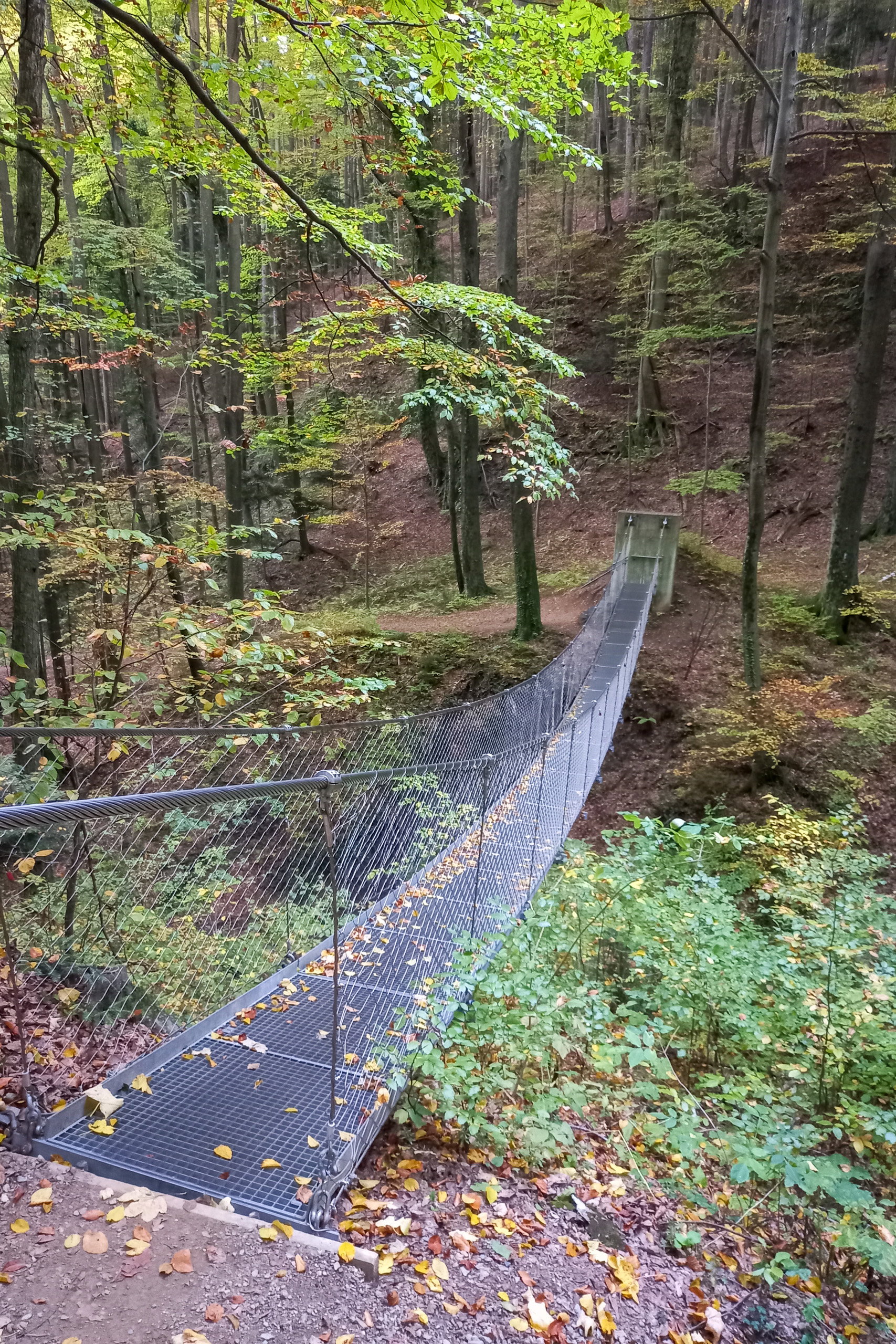Passend zum Motto der Steirischen Bewegungsrevolution parke ich mein Rad neben der großen Info-Tafel oberhalb des Klammeinstiegs. Die Klammrunde wartet mit rund fünf Kilometern und 325 Höhenmetern auf mich. Der Aufstieg führt zunächst hinab, vorbei an einem schönen Weingarten, und dann in den Wald hinein. Entlang des Altenbachs geht es über Brücken, schmale Stege und Holzleitern stetig bergauf. Zunächst ist der Anstieg eher flach, zum Ausstieg hin wird er aber doch recht steil. Das Highlight der Klamm ist die 33 Meter lange Hängebrücke – für manche eine wackelige Angelegenheit, für mich eine Freude, die sich mit jedem Schritt weiter aufschaukelt.
