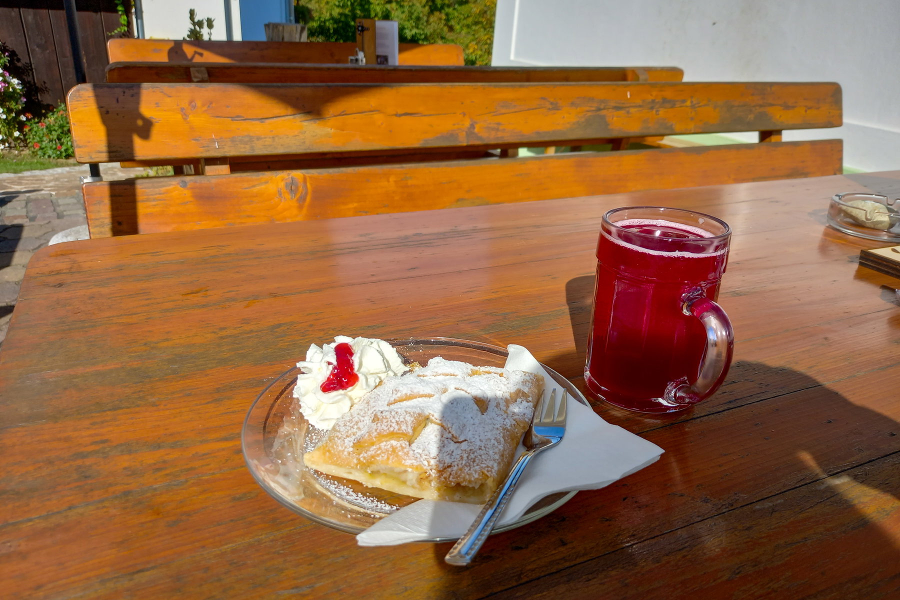Beim Abstieg folge ich einer kaum befahrenen Asphaltstraße, die mich wieder zum   Buschenschank Stelzl, direkt am Einstieg bringt. Und weil man auf einer Südsteiermark-Tour nie an einem Buschenschank vorbeifahren sollte, mache ich hier die schon beschlossene Einkehr. Ein feiner Apfelstrudel, ein spritziger Schilcher-Sturm – so sieht die perfekte Pause meiner Herbsttour aus.