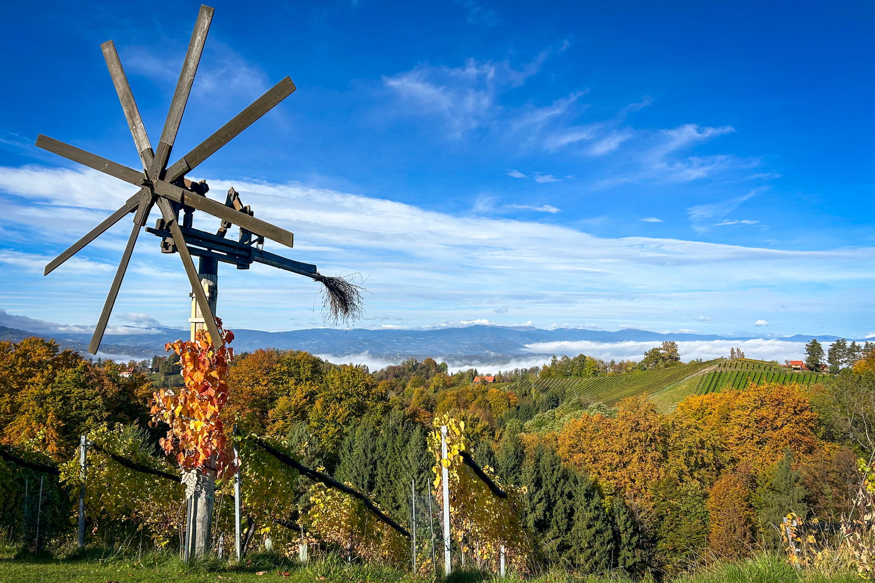 An besonders klaren Tagen reicht der Blick bis zur Koralpe und zu den Windrädern in der Weststeiermark. Am Wegesrand laden zahlreiche Rastbankerl mit Blick auf die sanften Weinhänge zum Verweilen und Aussicht genießen ein.