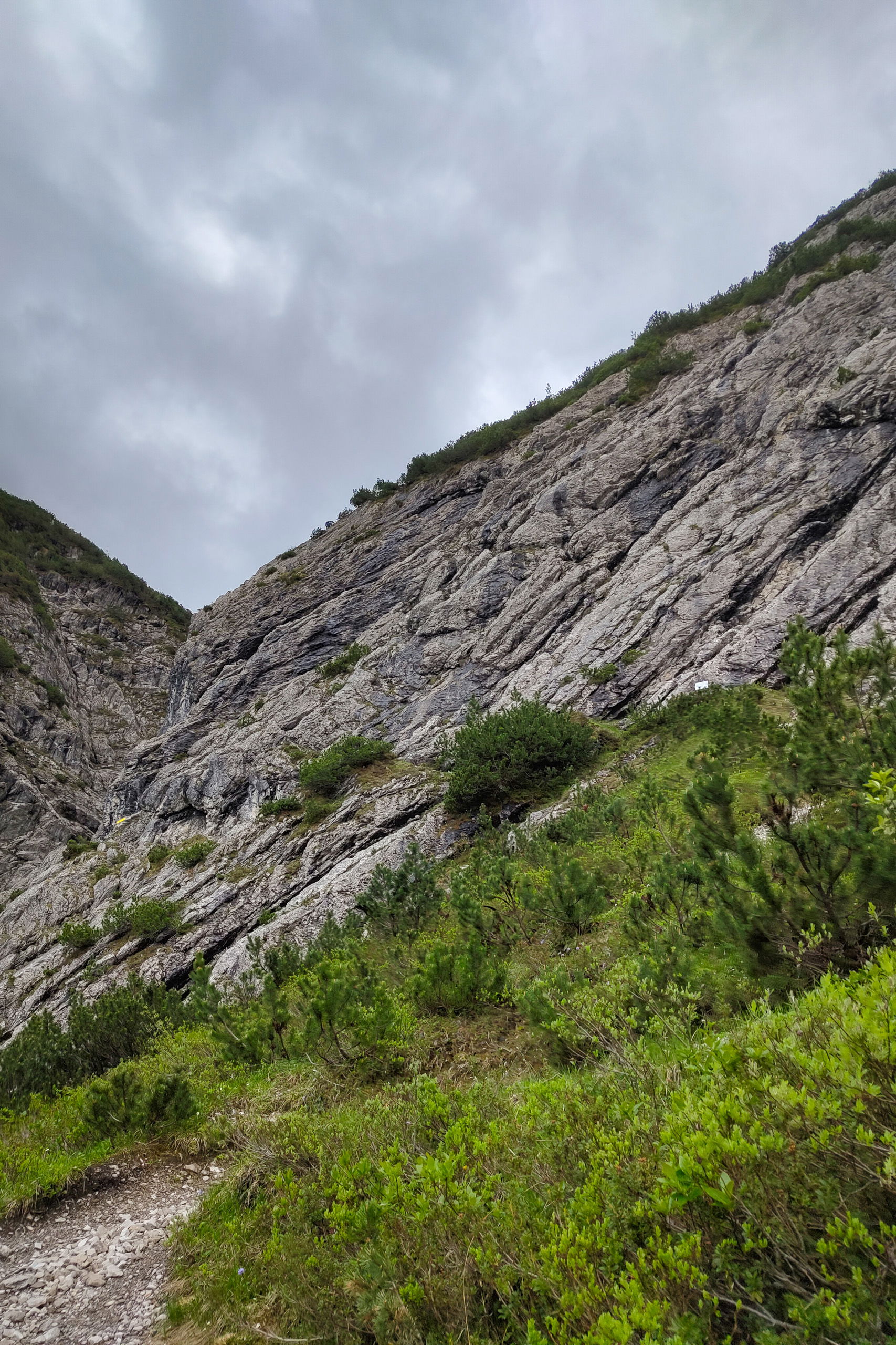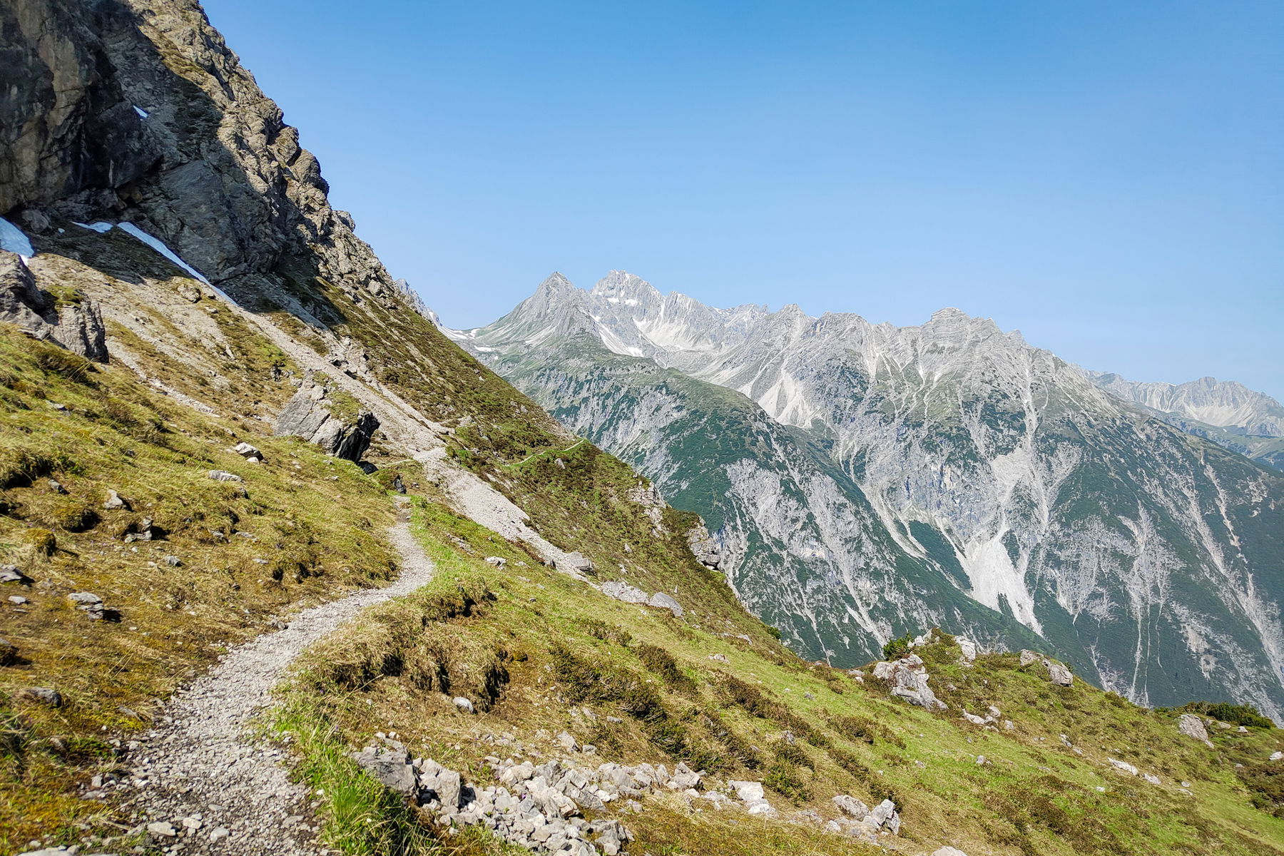 Bei der nächsten Abzweigung gehen wir durch Latschen weiter Richtung Gramais. Der Steig führt über 500 Höhenmeter steil bergab und erfordert Konzentration und fitte Knie.