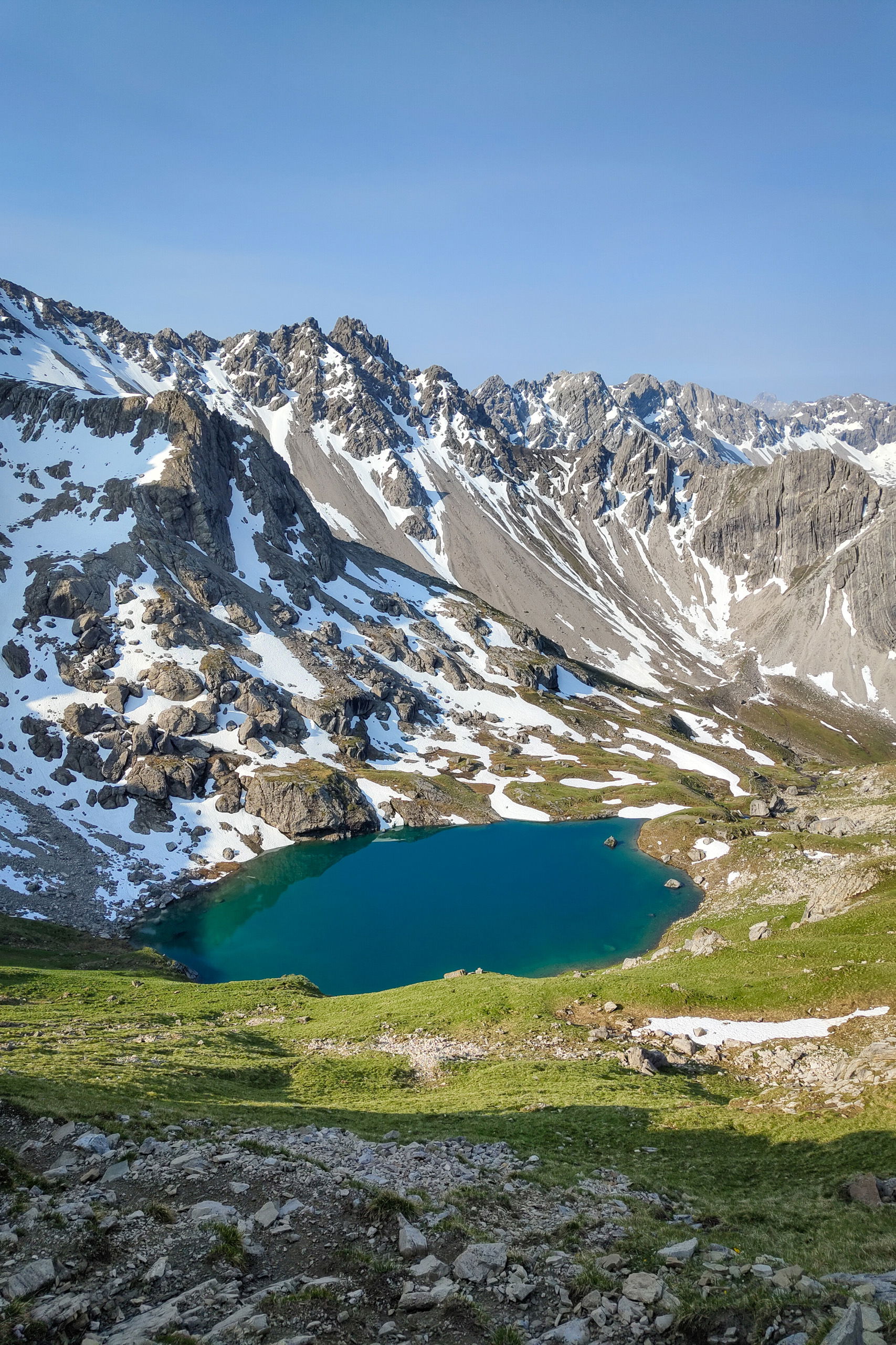 Wieder zurück am Gufelseejoch steigen wir Richtung Gramais ab. Der Blick auf den tiefblauen Gufelsee und die saftig grünen Wiesen als Kontrast zu den steilen Gipfeln und hell leuchtenden Altschneefeldern wirkt fast unrealistisch.