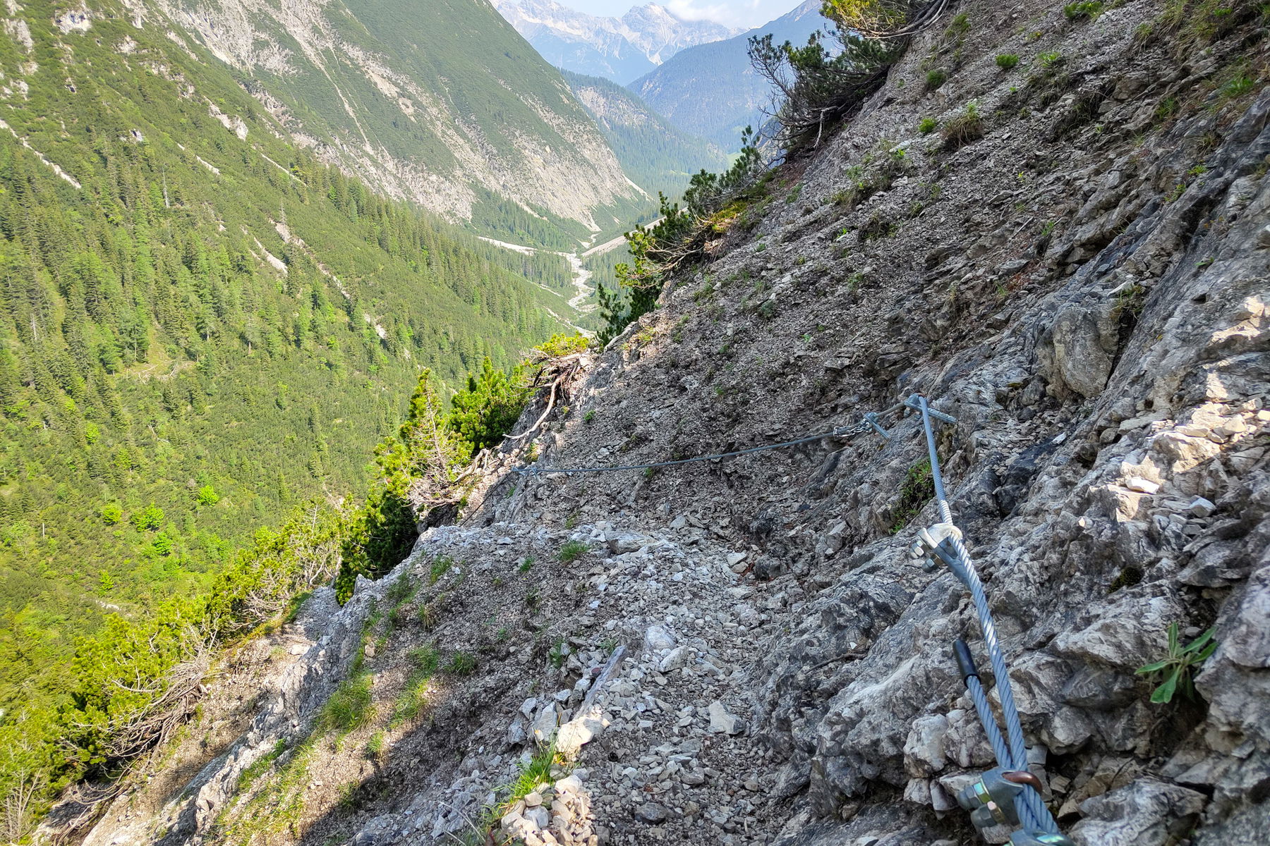 Nach der Hinteren Gufelalpe folgt eine stellenweise ausgesetzte Querung zur Vorderen Gufelalpe. Die Tiefblicke lassen einen anstrengenden weiteren Abstieg erahnen.