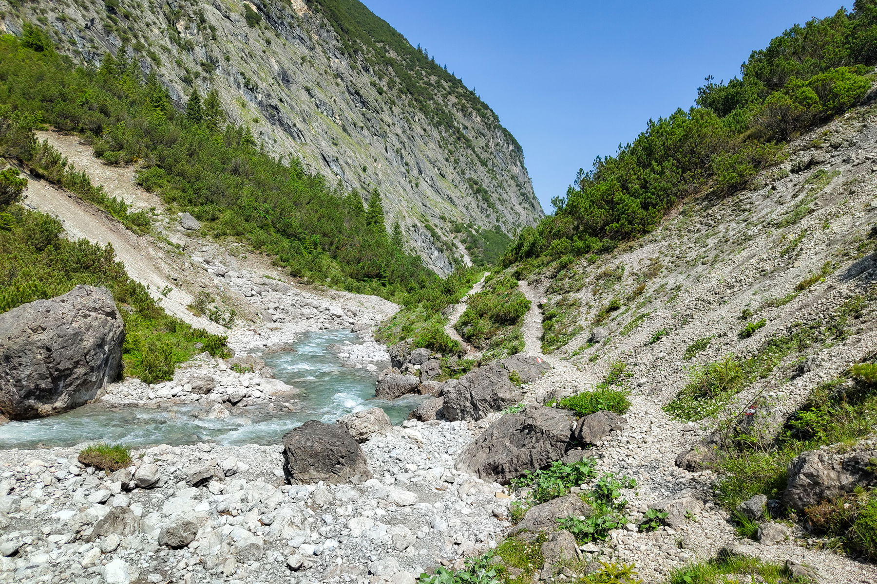 Am Talboden angekommen sind auch die Schwierigkeiten zu Ende. Gemütlich geht es die letzten 3,5 Kilometer dem Bachlauf folgend bis zum idyllischen Bergdorf Gramais.