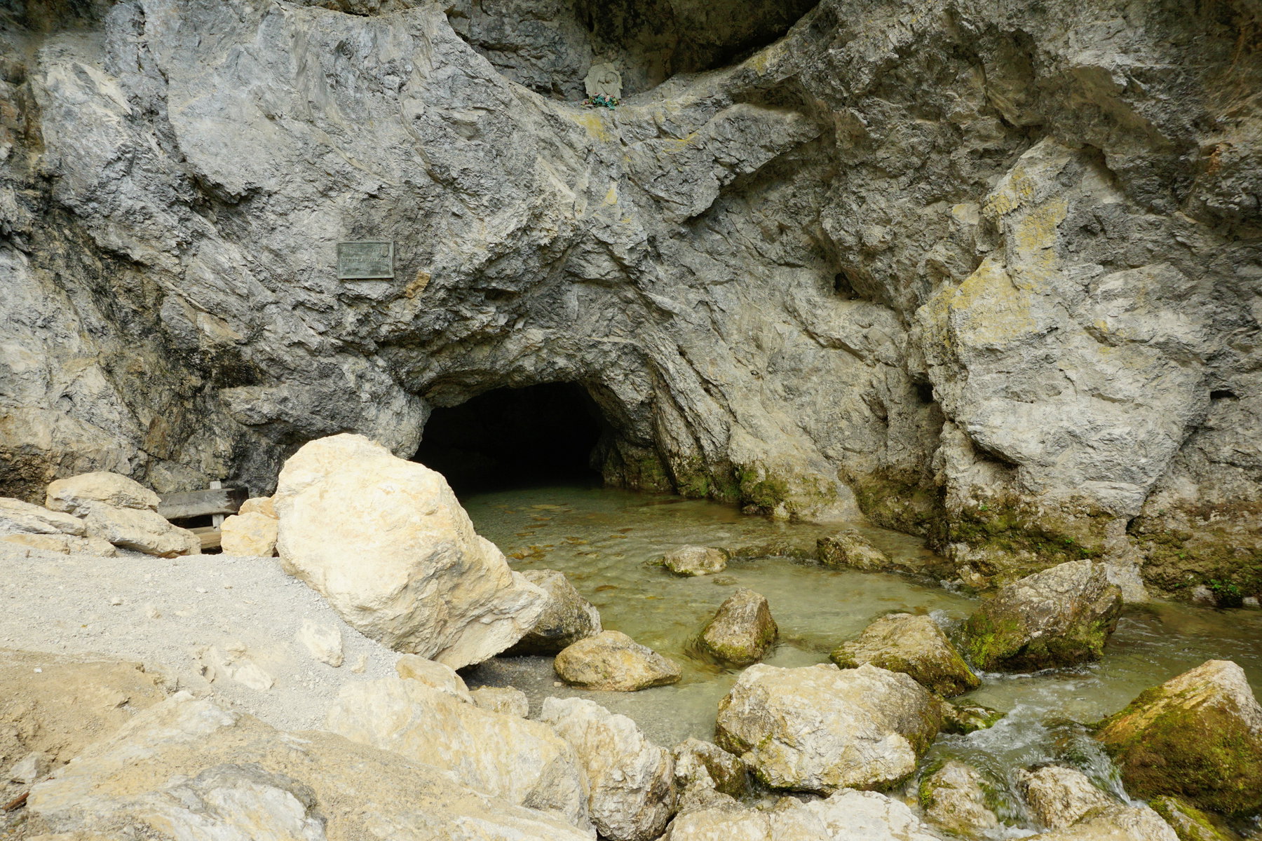 Die letzten Meter zur Höhle haben sich seit unserem letzten Besuch ziemlich verändert. Der Einstieg ist nun seilversichert, was recht praktisch erscheint, da wir von nun an im Grunde das Bachbett nach oben gehen und uns dadurch nasse Schuhe ersparen.
