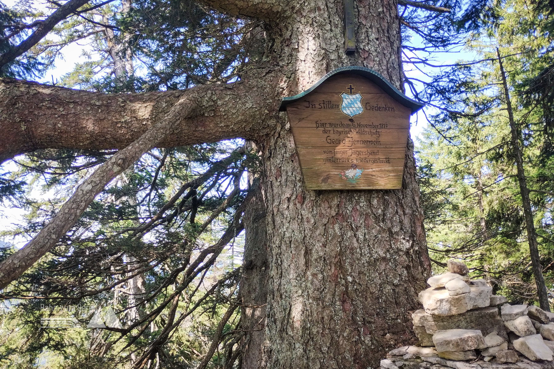 Vom Gipfel ostwärts führt unser Weg nun etwa 200 Höhenmeter bergab, an einer Wegkreuzung folgen Wir verlassen nach einer Pause die Wasserspitze wieder, der Weg führt uns zunächst leicht fallend in Richtung des nächsten Gipfels, die Rinnerspitze. Steil fällt die Grasflanke hier nach Osten ab und es ist Vorsicht geboten, denn der Weg ist sehr schmal. Besonders nach Regenfällen kann es hier rutschig und gefährlich werden. Am tiefsten Punkt zwischen den Gipfeln zieht ein Steig vom Bodenschneidhaus herauf und an einem Baum befindet sich ein Taferl zum Gedenken an den im Jahr 1877 hier erschossenen und legendären Wildschütz Jennerwein.