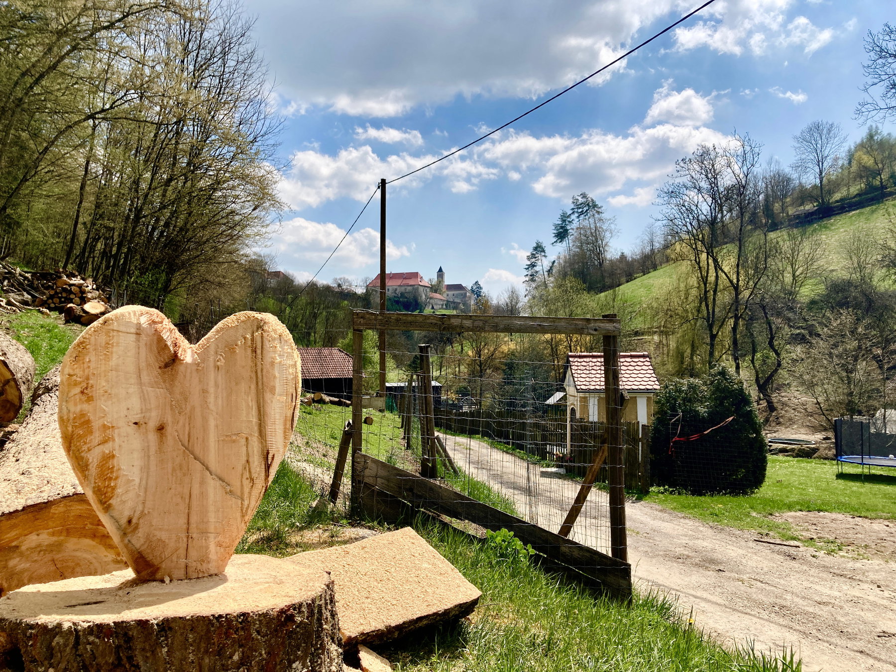 Dort treffen wir auf den ersten von vier Bächen: Es rauscht der kleine Eschelbach. Mit einem Herz aus Holz wird ein romantisch-schöner Wegabschnitt – mit tollem Blick auf das Schloss Eschelberg – eingeleitet. Der beschauliche Track endet jedoch bald wieder und wir stoßen auf eine Bezirksstraße, der wir wohl oder übel eine Weile entlang laufen müssen. Denn leider konnten wir keine Wanderwegführung entlang des Marbachs entdecken.