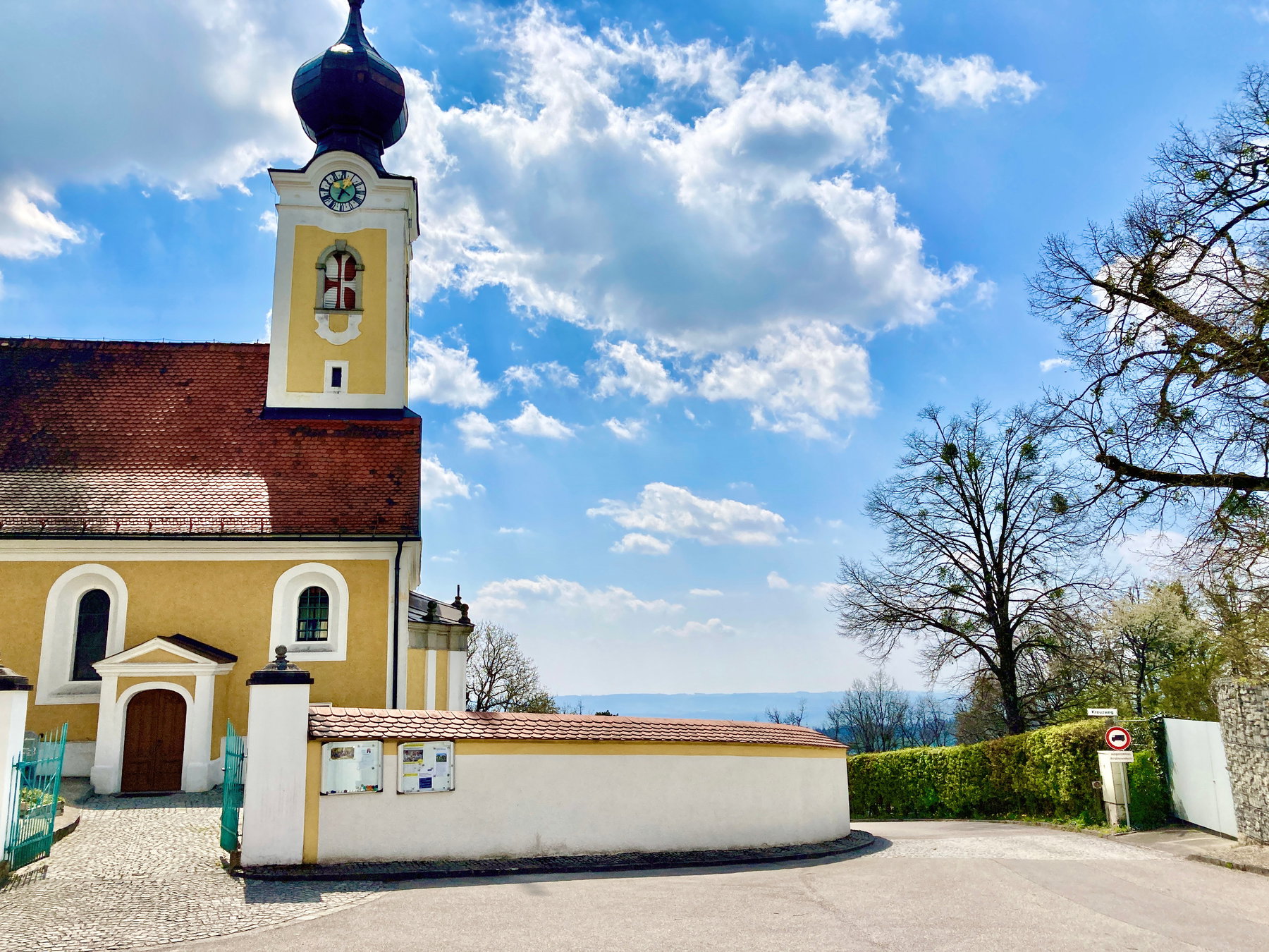 Man bekommt hier aber nochmal einen spektakulären Blick auf die ehemalige Burg – welche im Stil der Renaissance zu einem Schloß umgebaut wurde – geboten. Nach etwa 1,5 km entlang der großen Straße überqueren wir den Marbach und steigen über einen Wiesenweg nach St. Gotthard auf. Vorbei an einem Bauernhof mit Spezial-Getränkeservice erreichen wir die Kirche mit markantem Zwiebelturm – gebaut im Spätbarock, wie ich später nachlese.