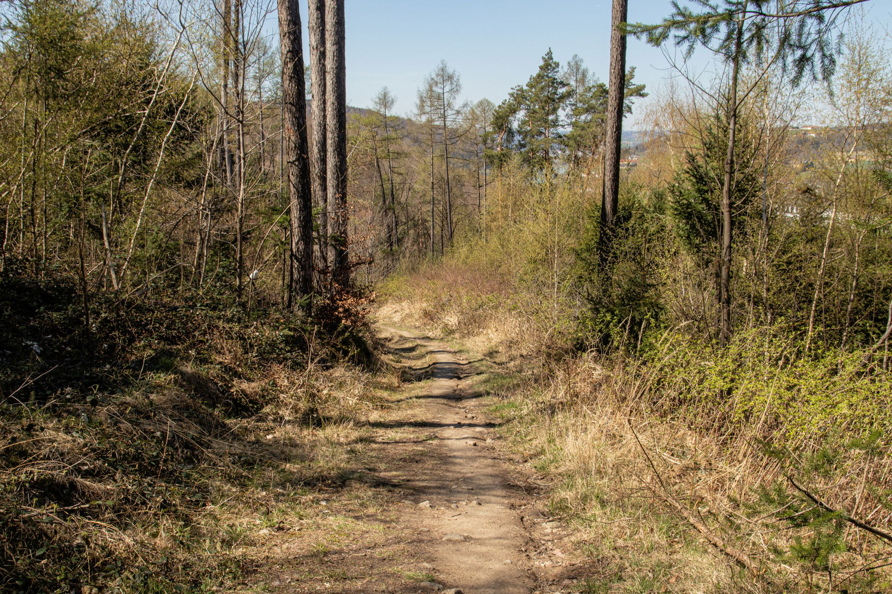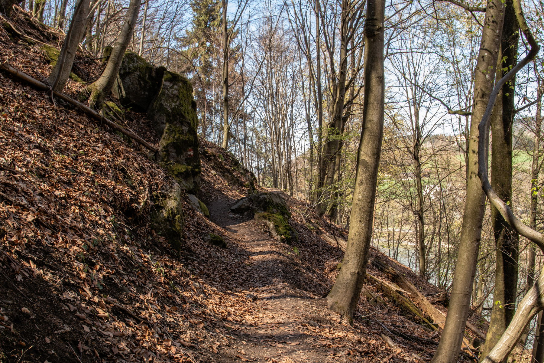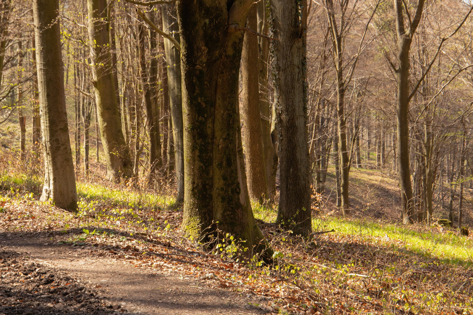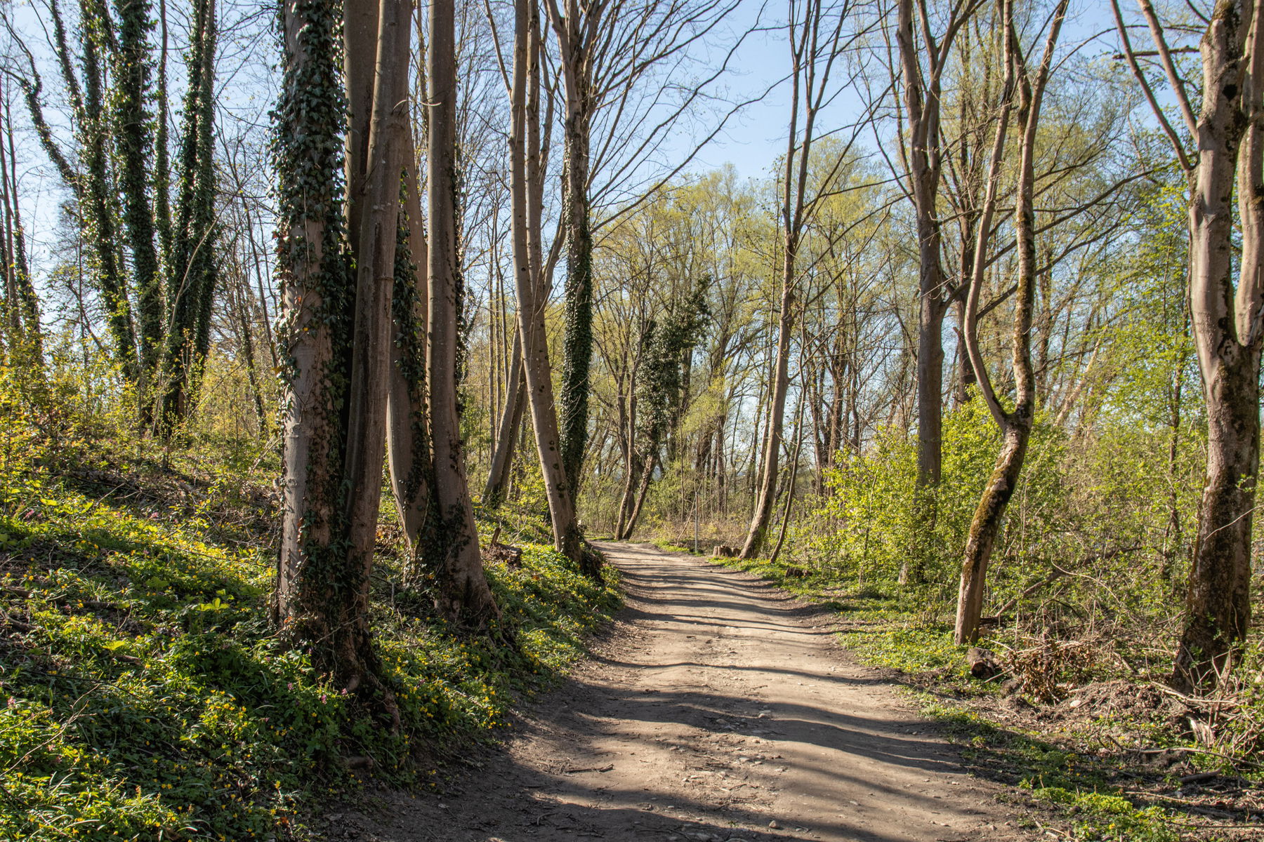 Schließlich wird der Hang flacher und der der Steig geht über in einen Waldweg mit zartem Frühlingsgrün.
