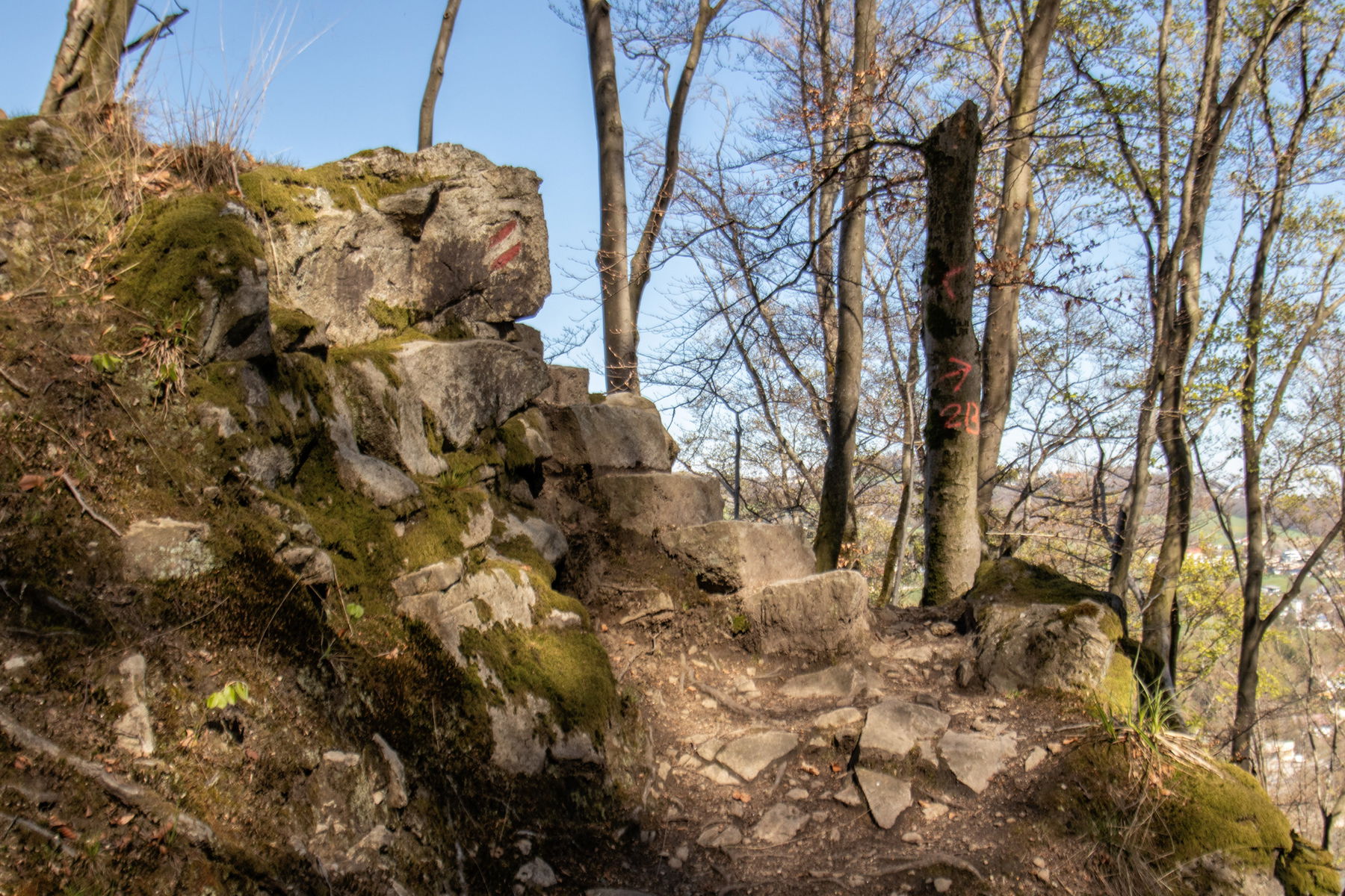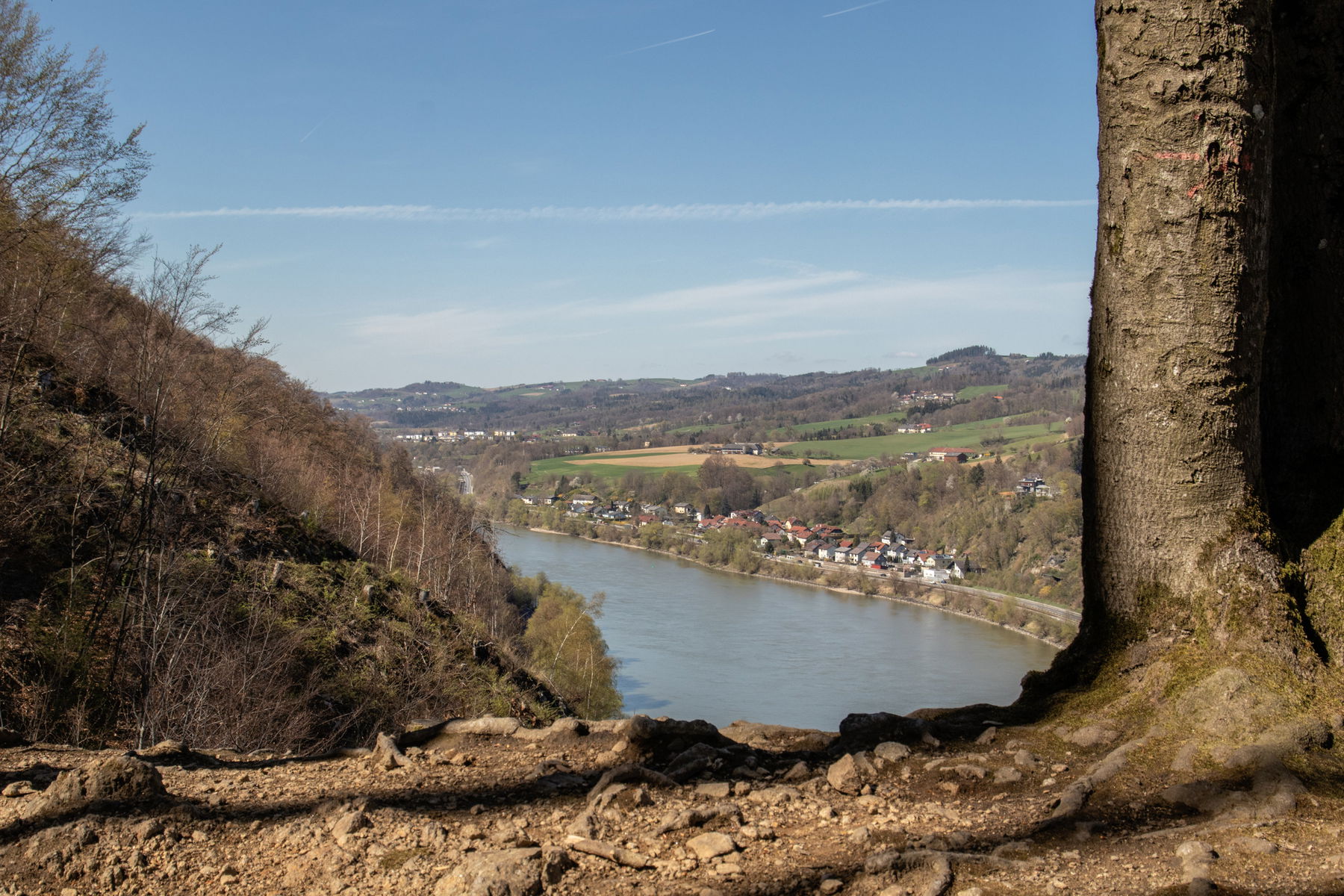 Dann geht’s weiter entlang des Donauhanges mit Überquerung von einigen kleinen Rinnsalen. Schließlich komme ich über Steinstufen zum Aussichtsplatz des Prinzensteiges.