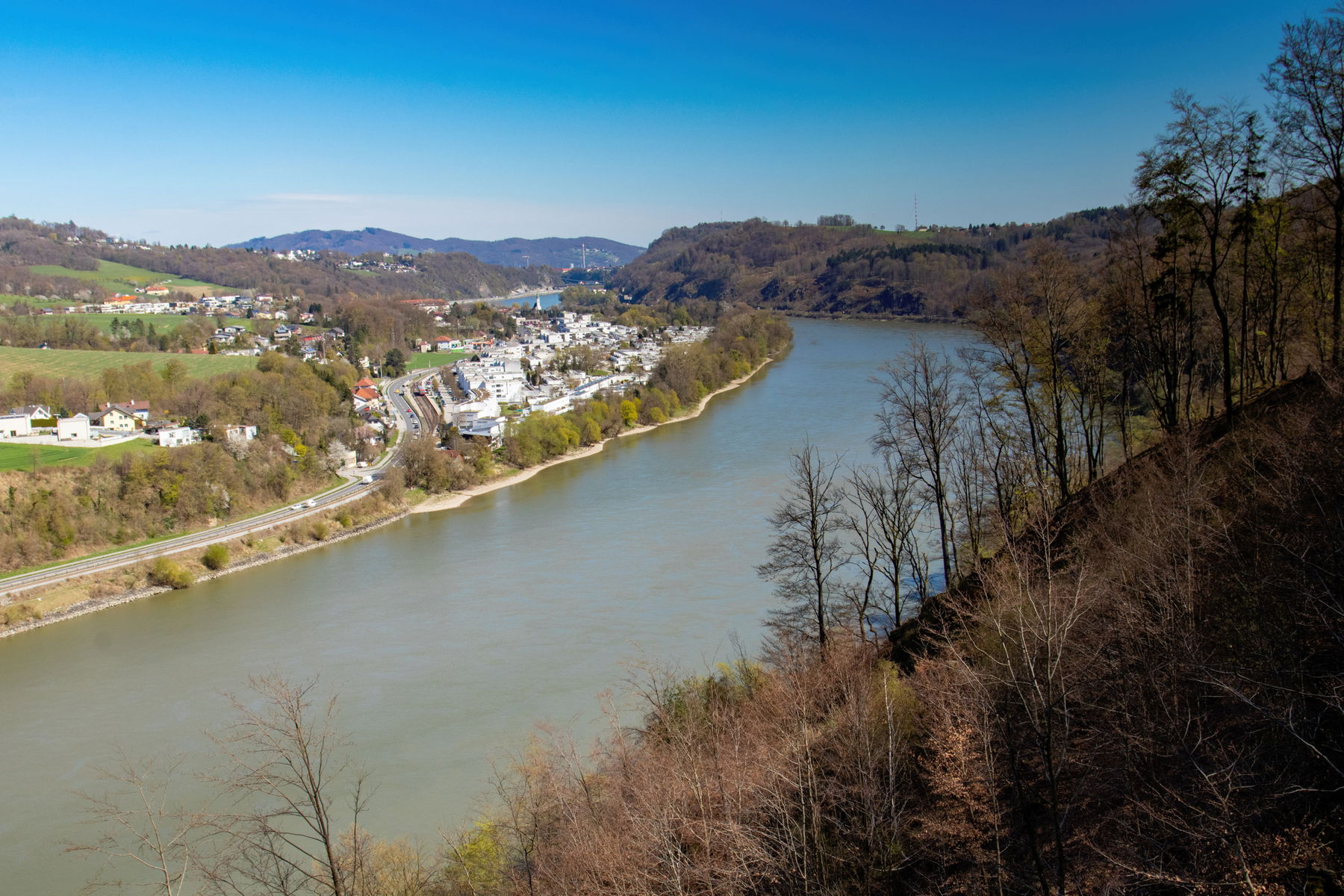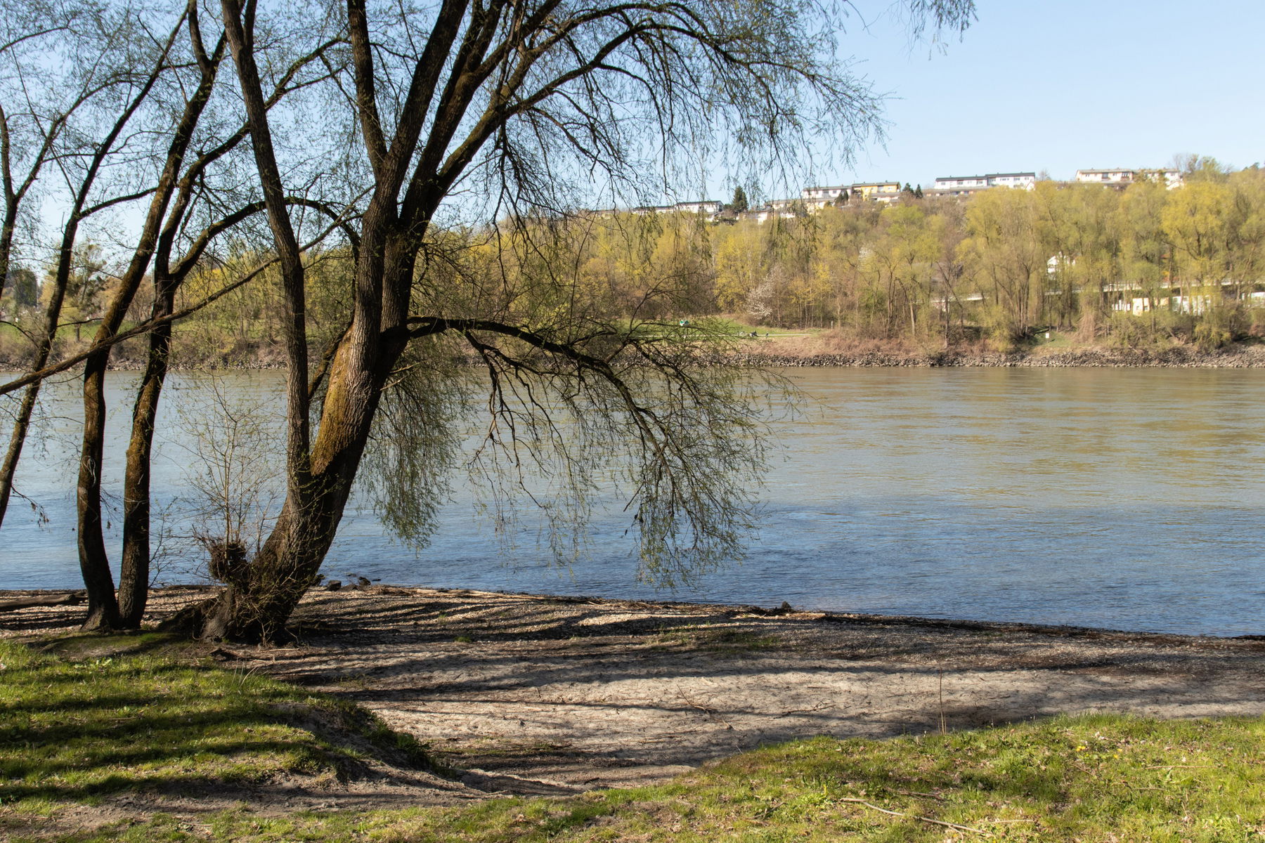 Gemütlich geht’s leicht bergab weiter. Rechts von mir sehe ich über die Donau bis zum Pöstlingberg. Zwischen den Bäum blitzen die Häuser von Puchenau durch. Links des Weges Natur pur. Das entfernte Rauschen der B 127 begleitet mich und vermischt sich mit Vogelgezwitscher und Frühlingsduft.