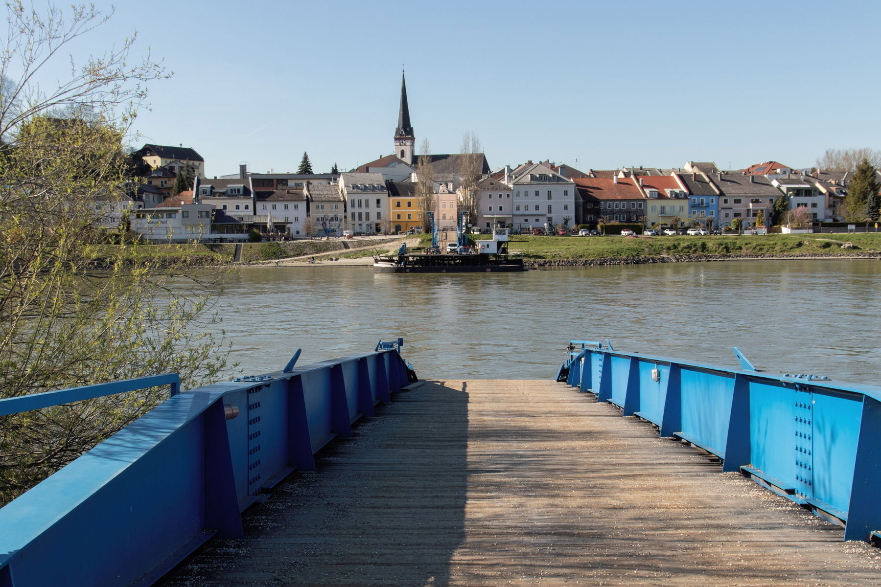 Schließlich bin ich am Steg der Drahtseilbrücke angekommen und blicke auf das Panorama von Ottensheim am anderen Ufer.