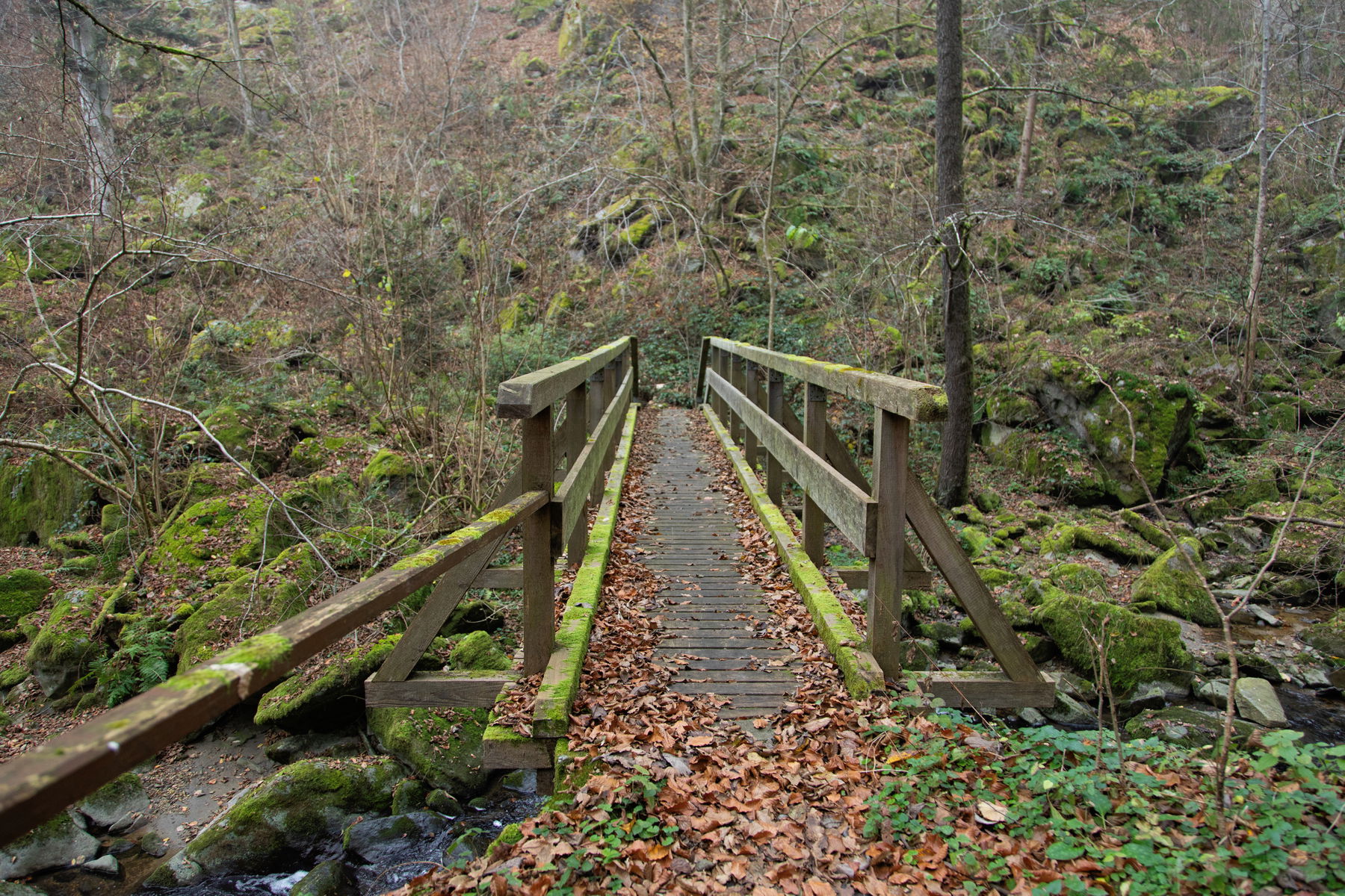 Bereits nach etwa 500 Metern quere ich den Bach abermals. Nun fließt sie wieder links von mir. Ich bleibe am Waldweg links der Rodl, bis ich einen hölzernen Brückensteg sehe, der mich das letzte Mal über die kleine Rodl führt.