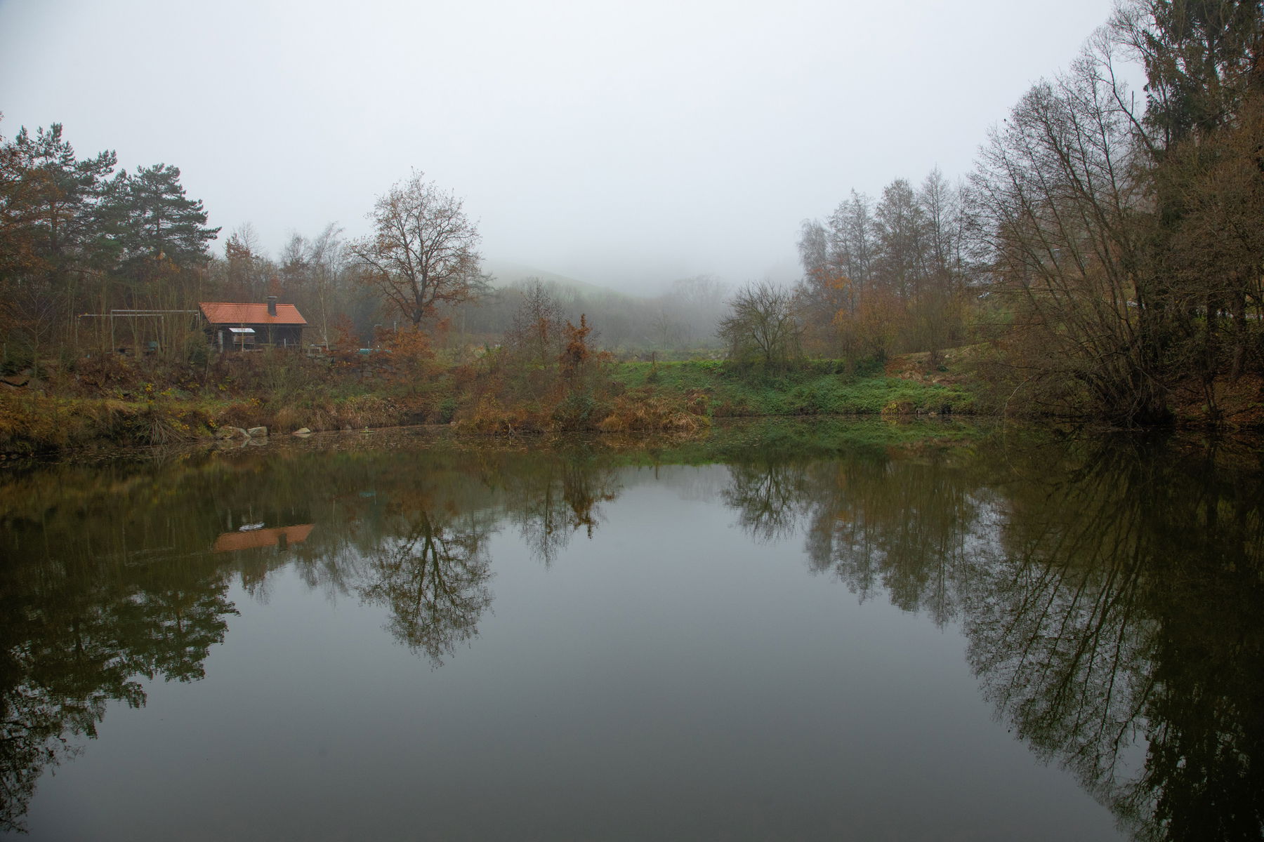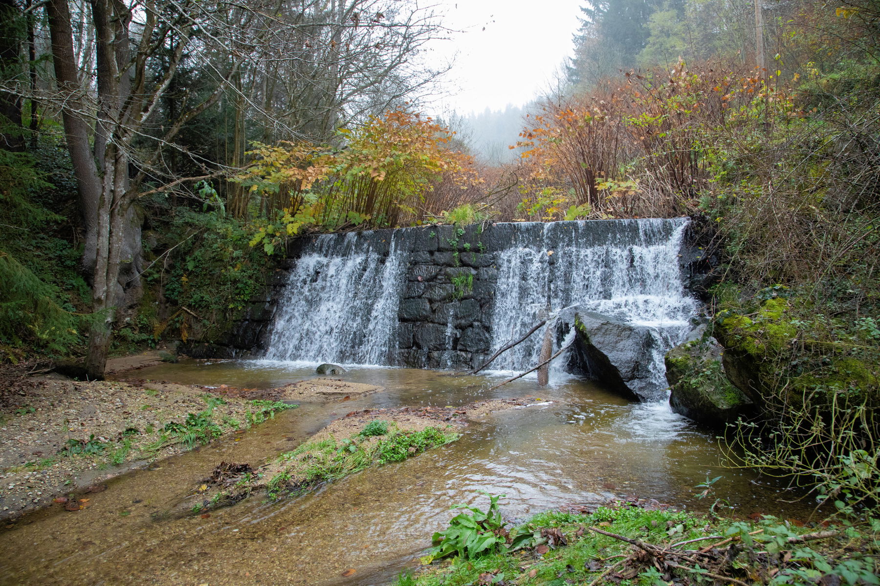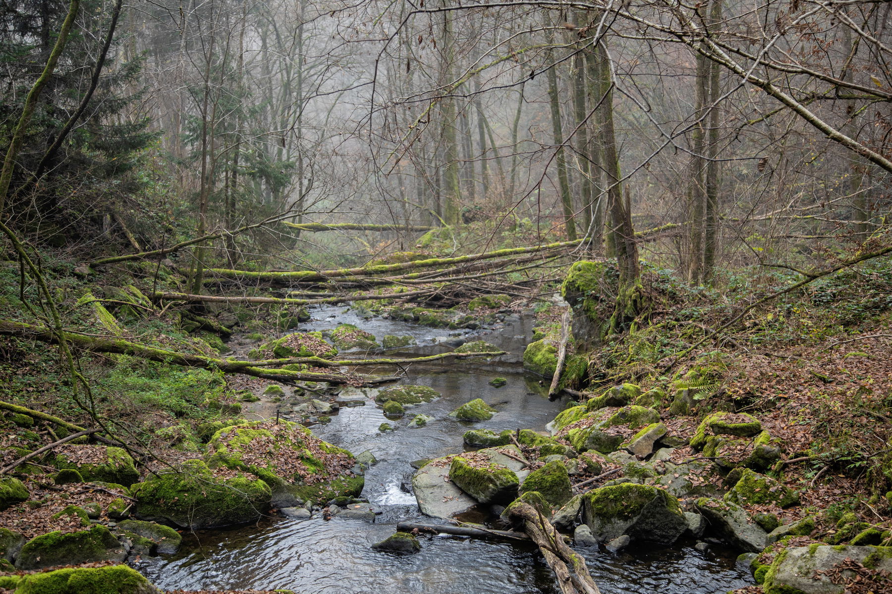 Und schon geht’s los. Leider hat sich die frühe Morgensonne mittlerweile hinter dem Nebel versteckt. Doch das mindert meine Vorfreude nicht. Ich mag die mystische Nebelstimmung in Verbindung mit Bächen und Burgen.