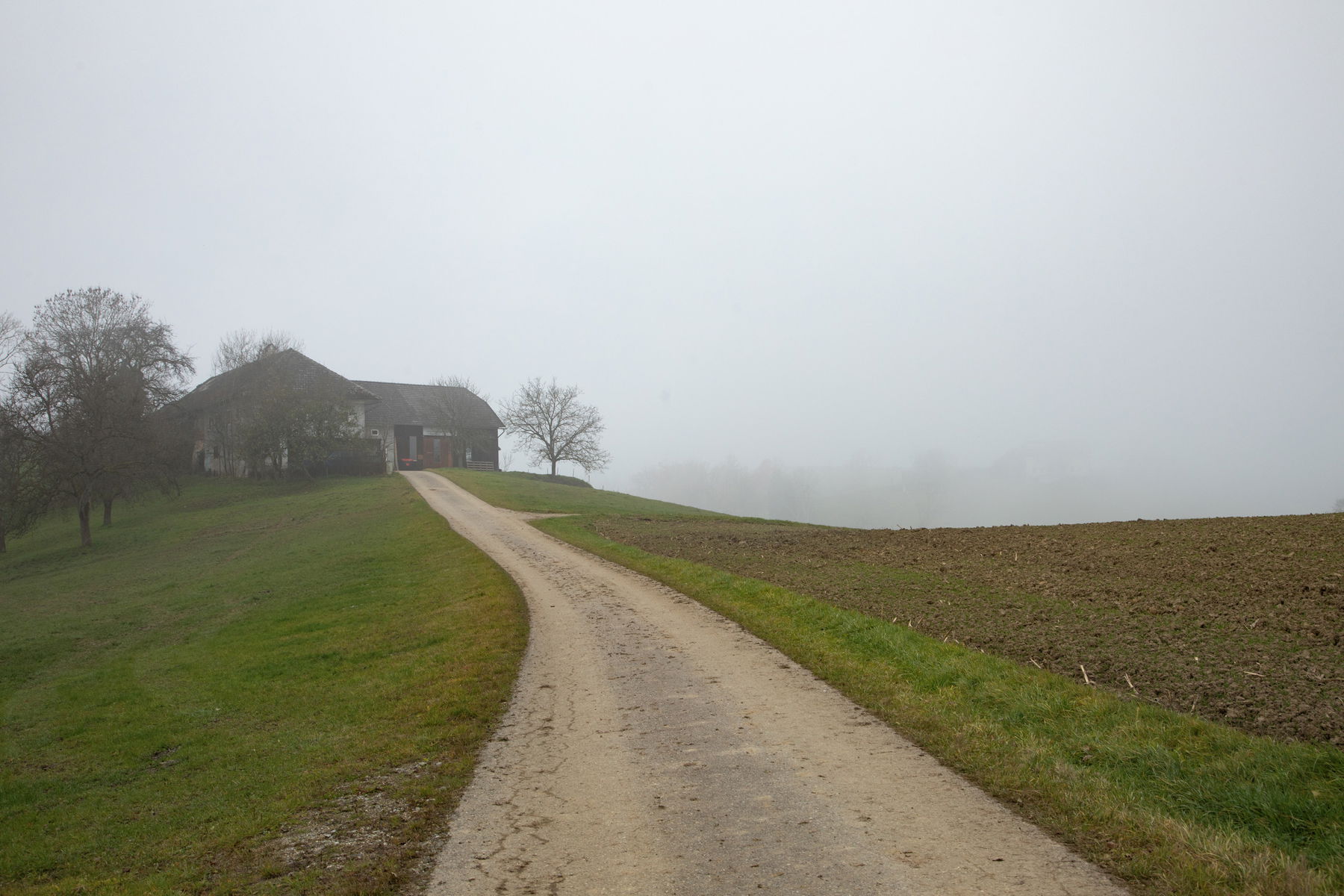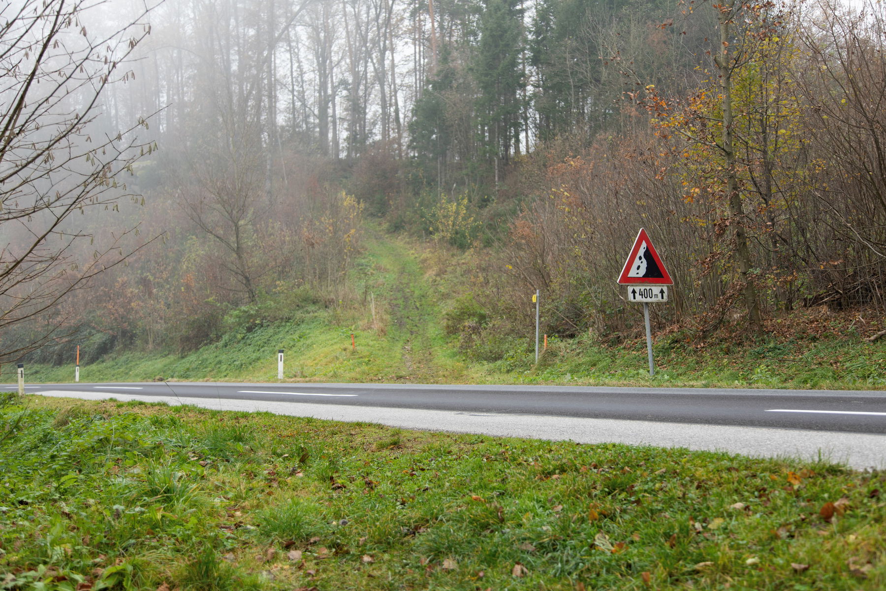 Nach Überquerung der Holzbrücke gehe ich halbrechts entlang eines Pfades ein kurzes Stück sprichwörtlich über Stock und Stein bis der Pfad sich wieder beruhigt, in einen schmalen Weg bergauf und dann in einen Wiesenweg (in St. Gotthard als „Reanhoid“ bezeichnet) übergeht. Nach Überquerung der Wiese komme ich zu einer Güterweg Kreuzung. Ganz rechts geht es bergauf zu einem Bauernhof (Stöckl), links geht’s ebenso bergauf zur Kirche St. Gotthard, halblinks geht es bergauf zum Göweiler. Ich gehe nun entlang vom Güterweg St. Gotthard leicht bergab und biege nach wenigen Metern links in einen Schotterweg. Rechts von mir komme ich vorbei an einem alten Sacherl. Ich folge dem Weg und überquere ein kleines Bächlein (Marbach) und kurz darauf die Herzogsdorfer Straße (L1510).