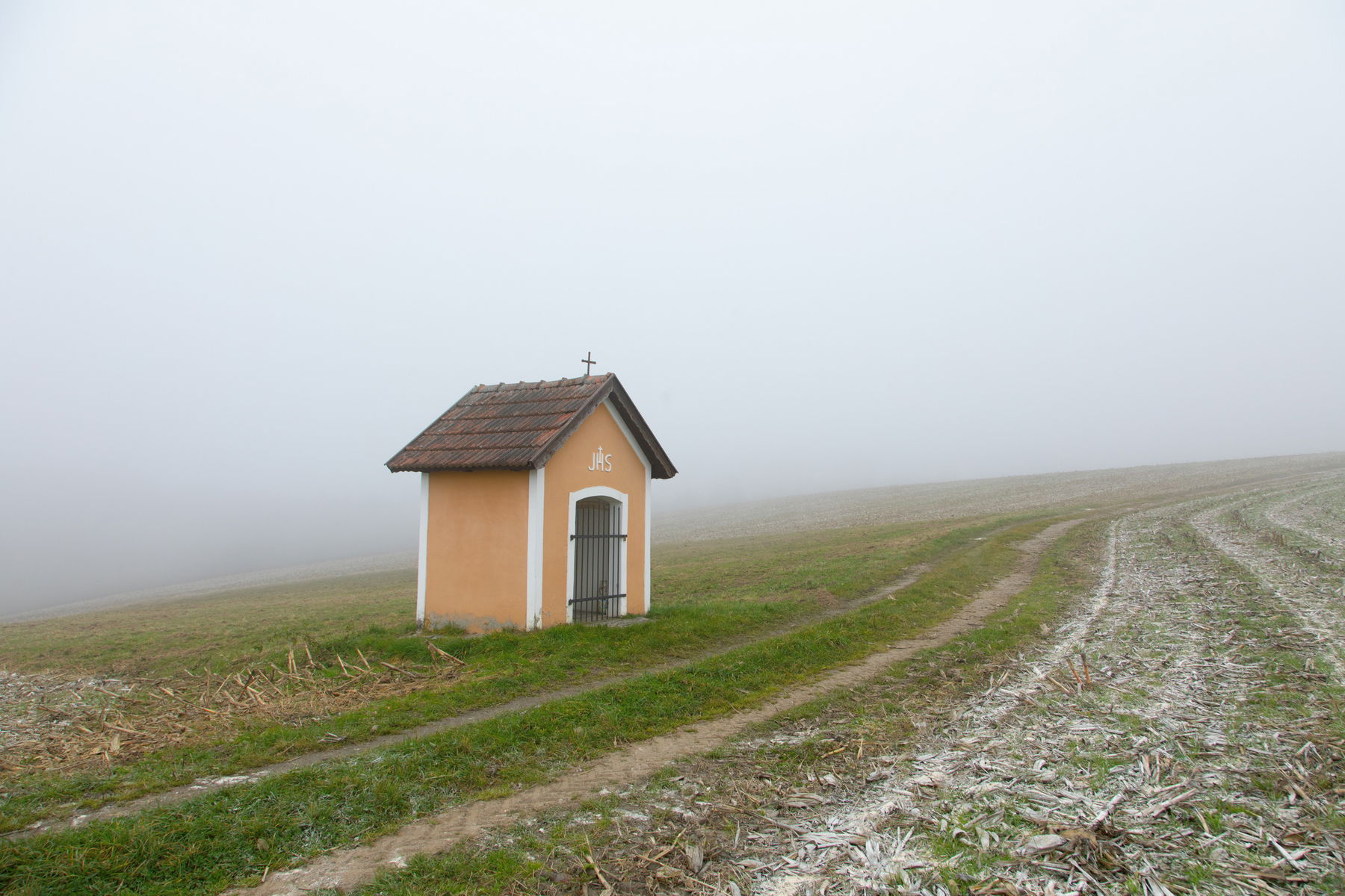 Jetzt wandere ich wieder leicht bergauf und nach wenigen Höhenmetern biege ich rechts ab, gehe vorbei an der Kapelle Mayr zu Hagedorn und wende nahe einem Bauernhof und einer kleinen Siedlung (Hofstatt) nach links. Ich folge dem Feldweg und überquere ein kleines Bächlein. Nun geht der Pfad über in den Güterweg Obereschelberg.