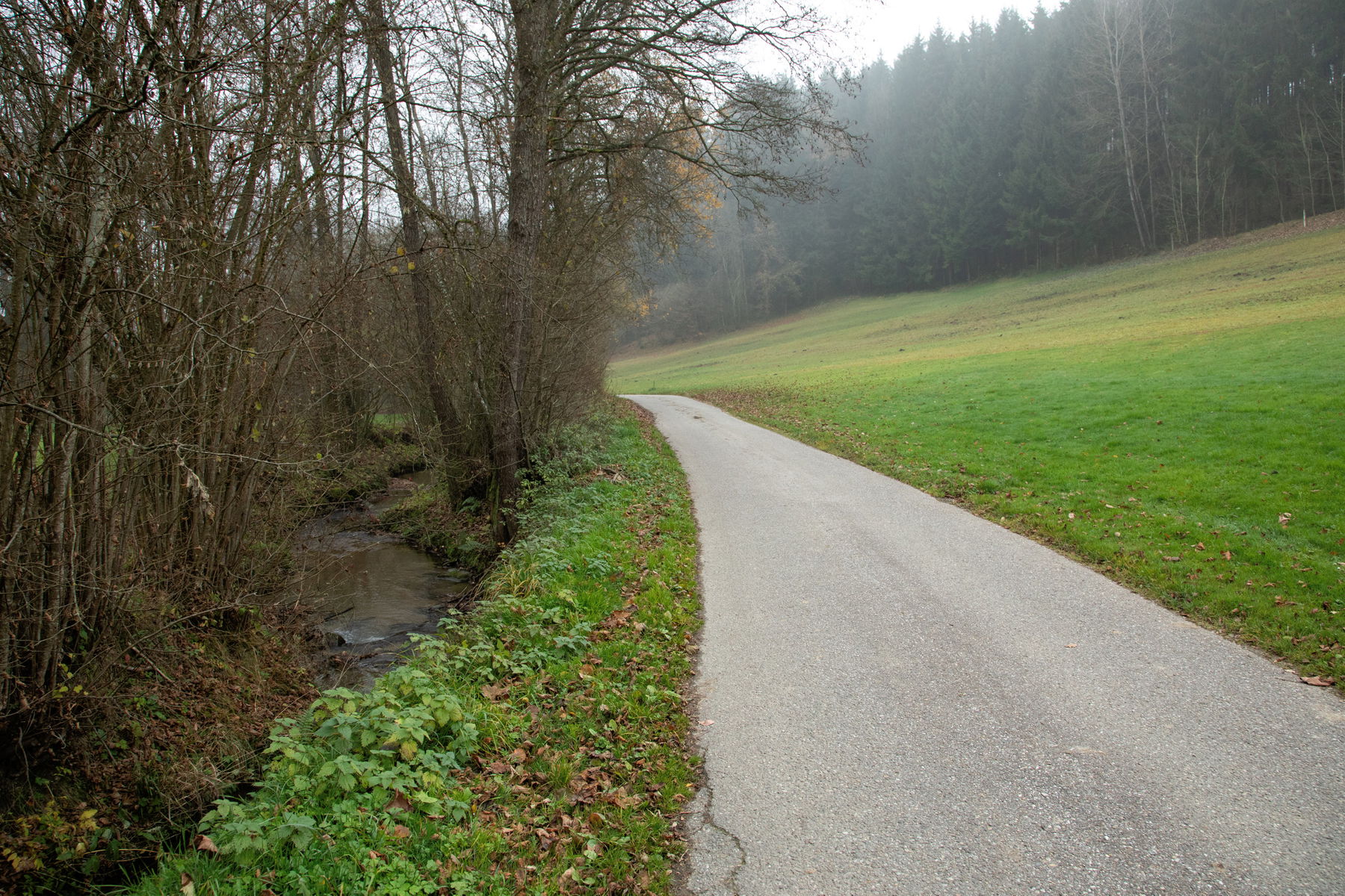 Der Wald- und Wiesenweg endet hier und geht zunächst über in die asphaltierte Mühlholz Straße und kurz darauf in die Eschelbachtal Straße. Ich folge dem Straßenverlauf stets entlang vom Eschelbach. Nach etwa 1,3 Kilometern wird die Asphaltstrecke zur Schotterstraße.