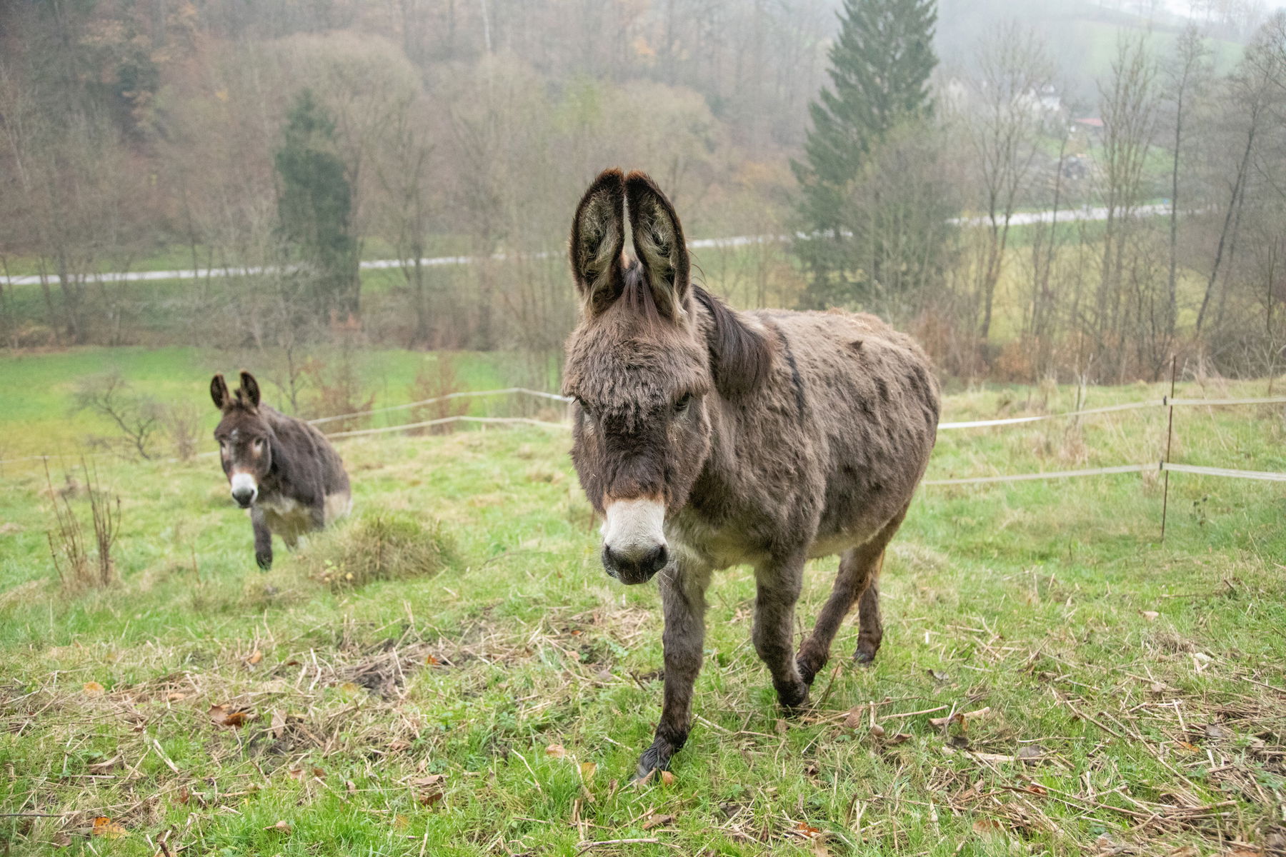 Schließlich führt mein Weg, wie auch der Verlauf vom Eschelbach, zur Rottenegger Straße (L1510). Ich biege rechts ab auf die Landesstraße, die hier den Eschelbach überquert. Gleich nach der Bachüberquerung folge ich rechts einem zunächst schmalen Waldweg (Gebiet Hangermayrreith). Der Ortsteil Rottenegg ist schon nahe. Doch bevor ich ins Siedlungsgebiet komme, wird es nochmal ländlich idyllisch. Dafür sorgt eine Weide mit zwei unglaublich entzückenden Eseln.