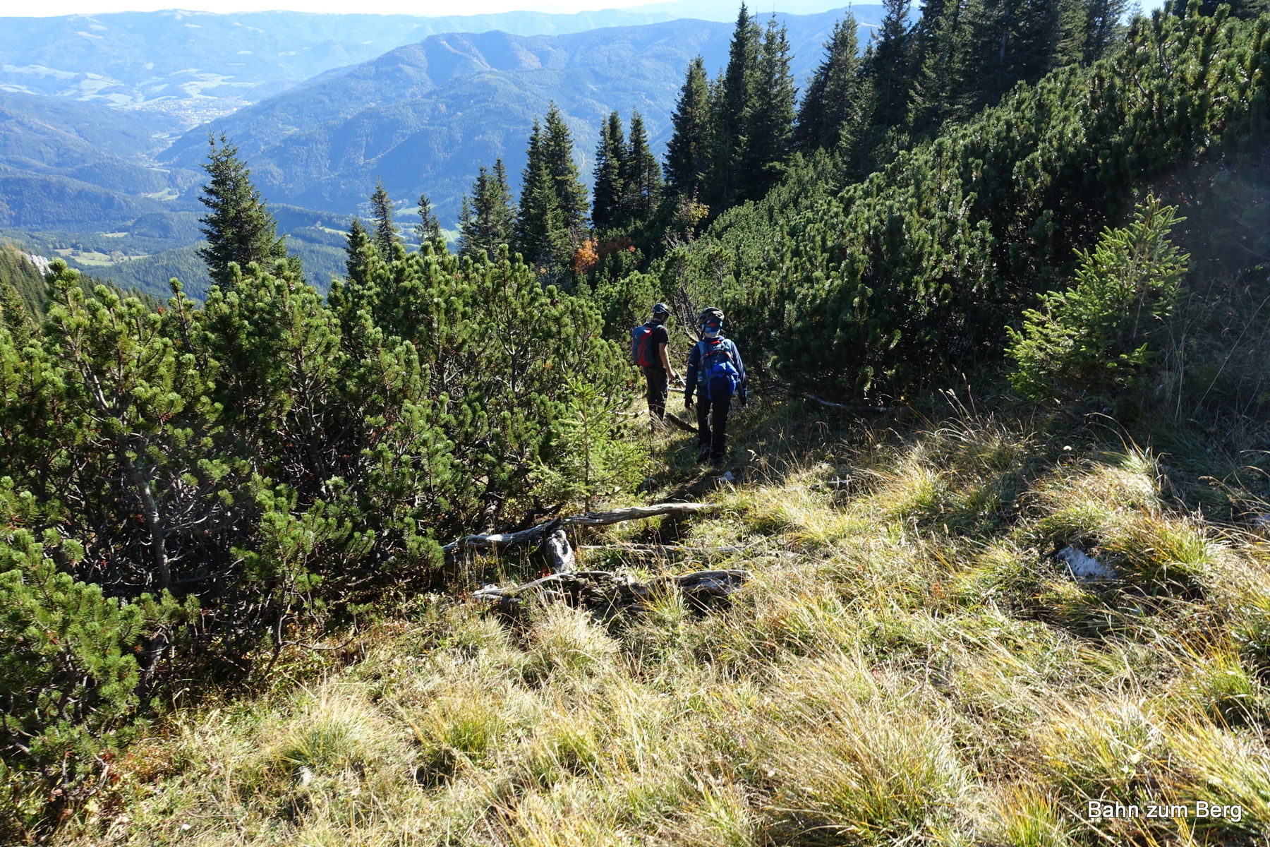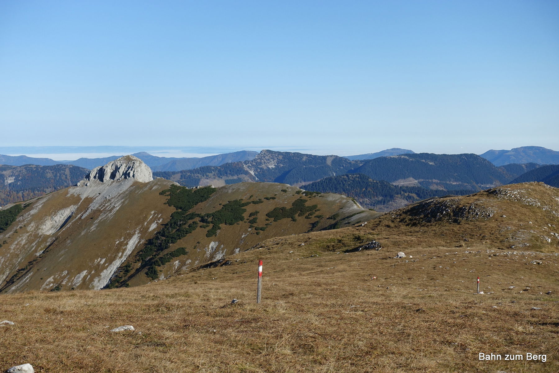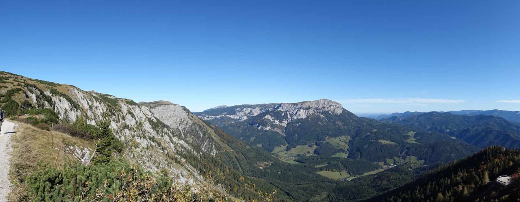 Ab jetzt sind wir endgültig über der Baumgrenze und genießen bei herrlichem Wetter ein sehr schönes Panorama auf Rax, Mürztal und alles rundherum.