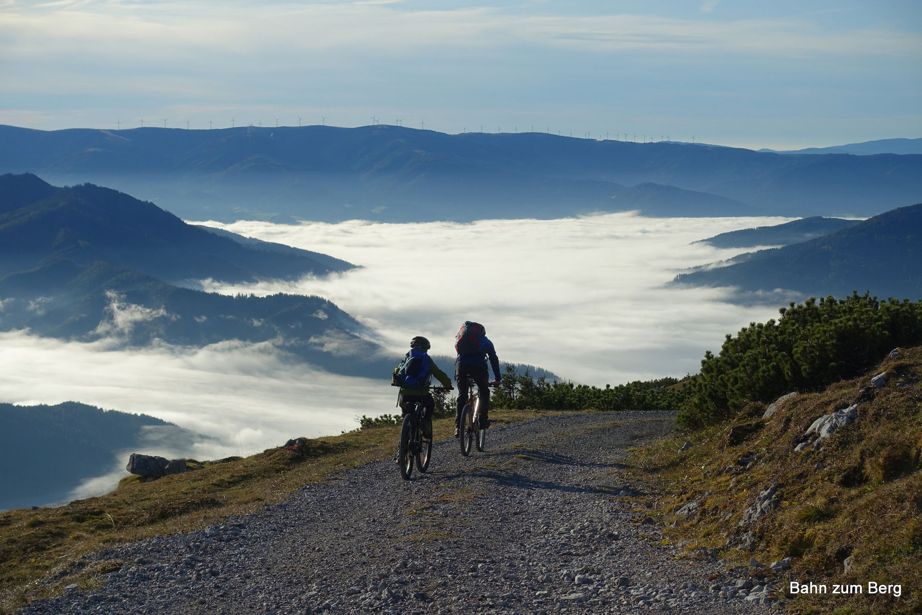 Unser erstes Ziel für heute ist der Windberg. Dafür fahren wir über die Straße zum Michlbauer hinüber. Im Blickfeld das Nebel gefüllte Mürztal.