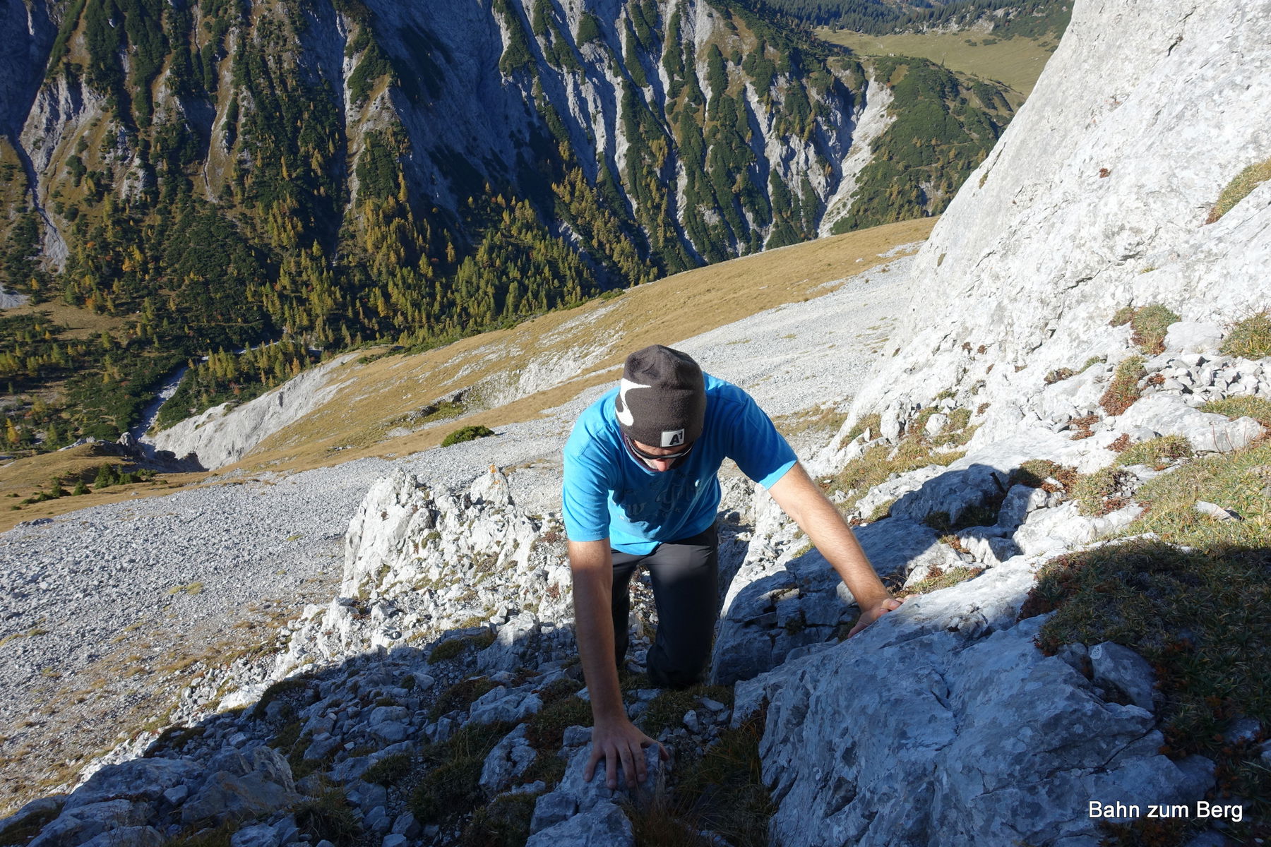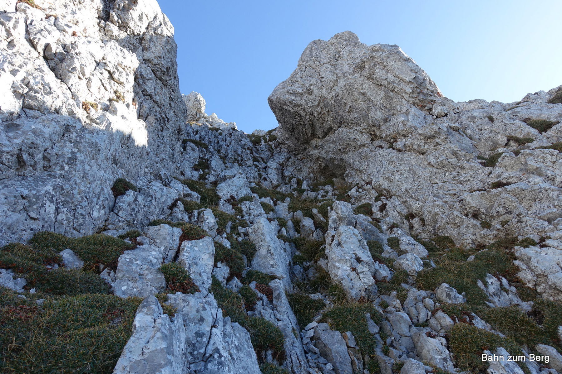 Der Weg hinauf führt nicht nur zu, sondern direkt in einer Verschneidung durch die Felsen hinauf. Es ist eine sehr angenehme 1er Kletterei. Das lose Geröll muss man etwas beachten, um nicht dem Nachsteiger etwas auf den Kopf zu werfen.