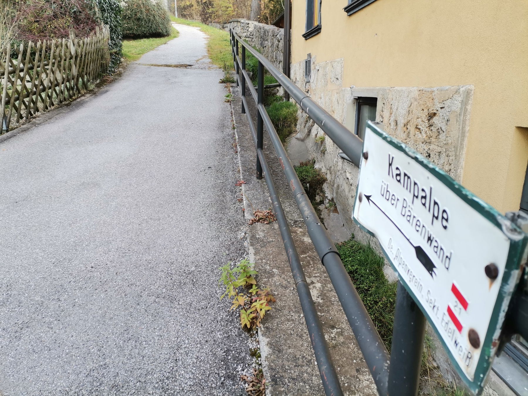 Neblig ist es noch, als ich kurz nach neun Uhr in Spital am Semmering aussteige. Oberhalb des Bahnhofes finde ich eine Markierung, die zum Steirischen Semmering Bahnwanderweg gehört. Der folge ich in Richtung Semmering durch den Ort mit seinen malerischen Häusern bis links ein Wegweiser mir roter Markierung zu Bärenwand und Kampalpe zeigt.