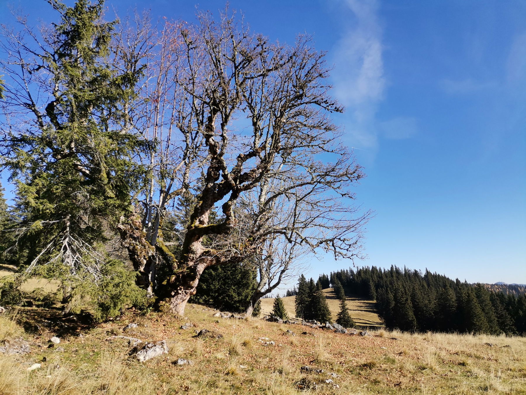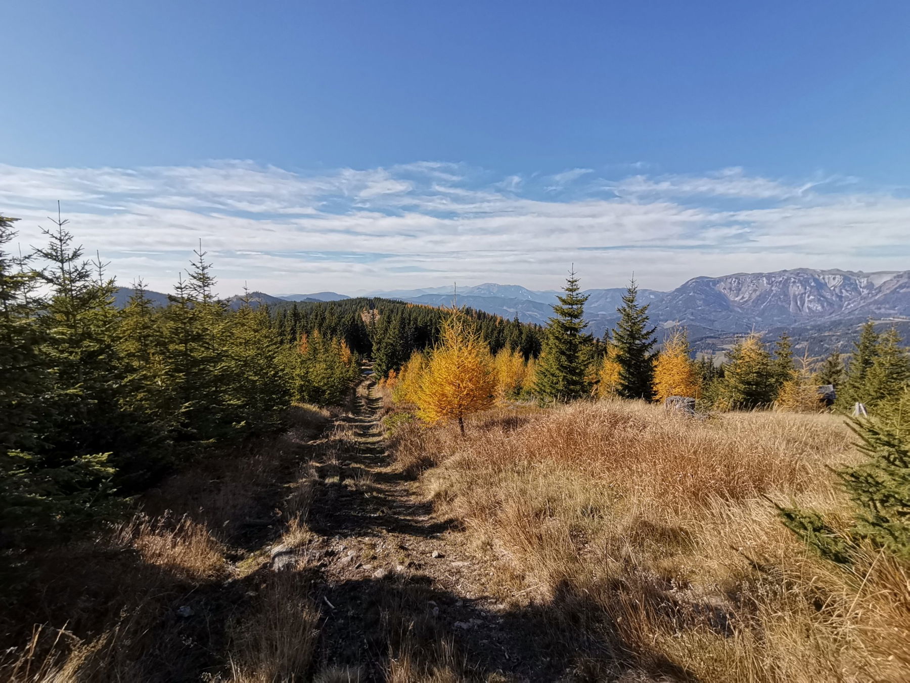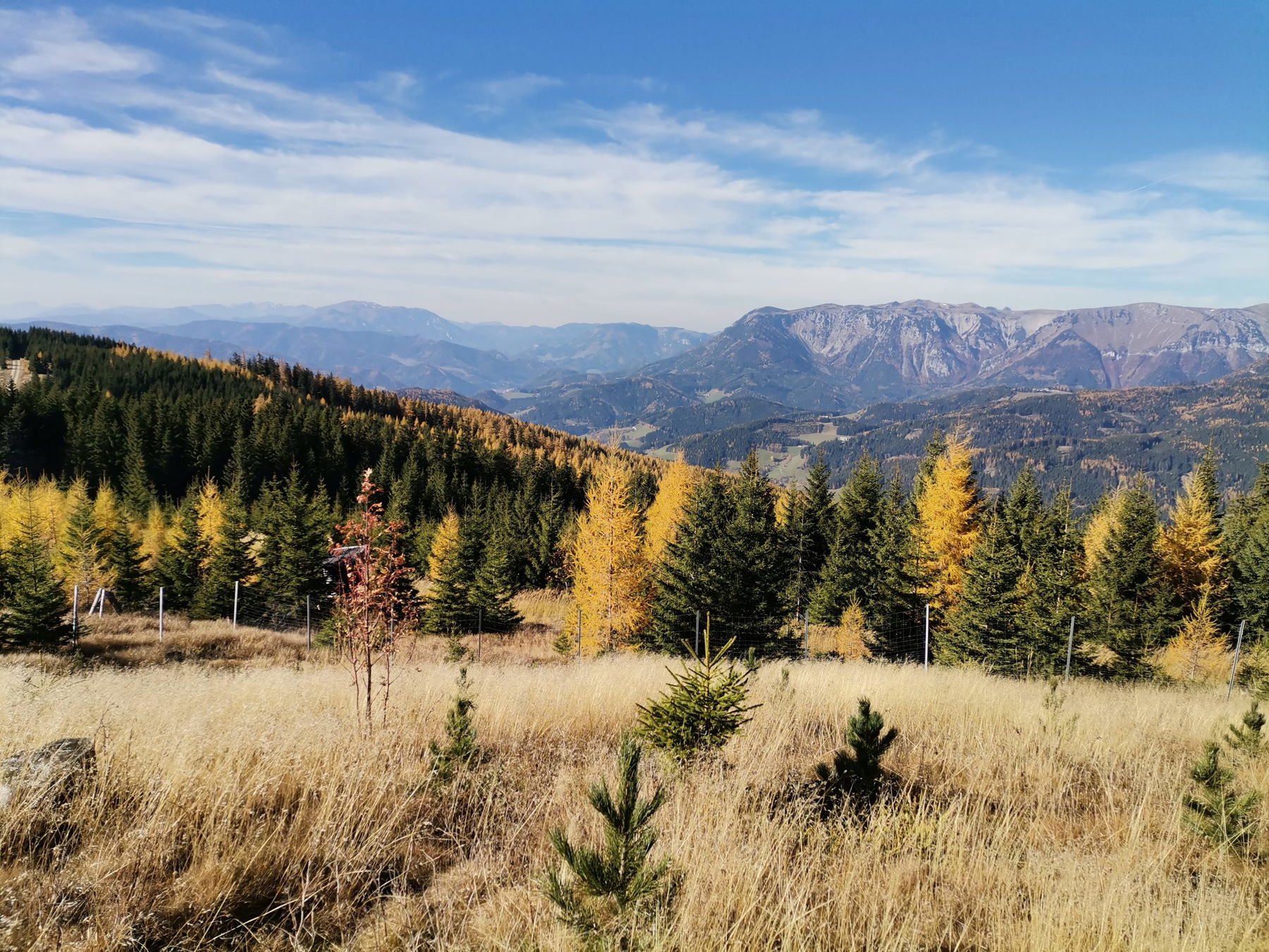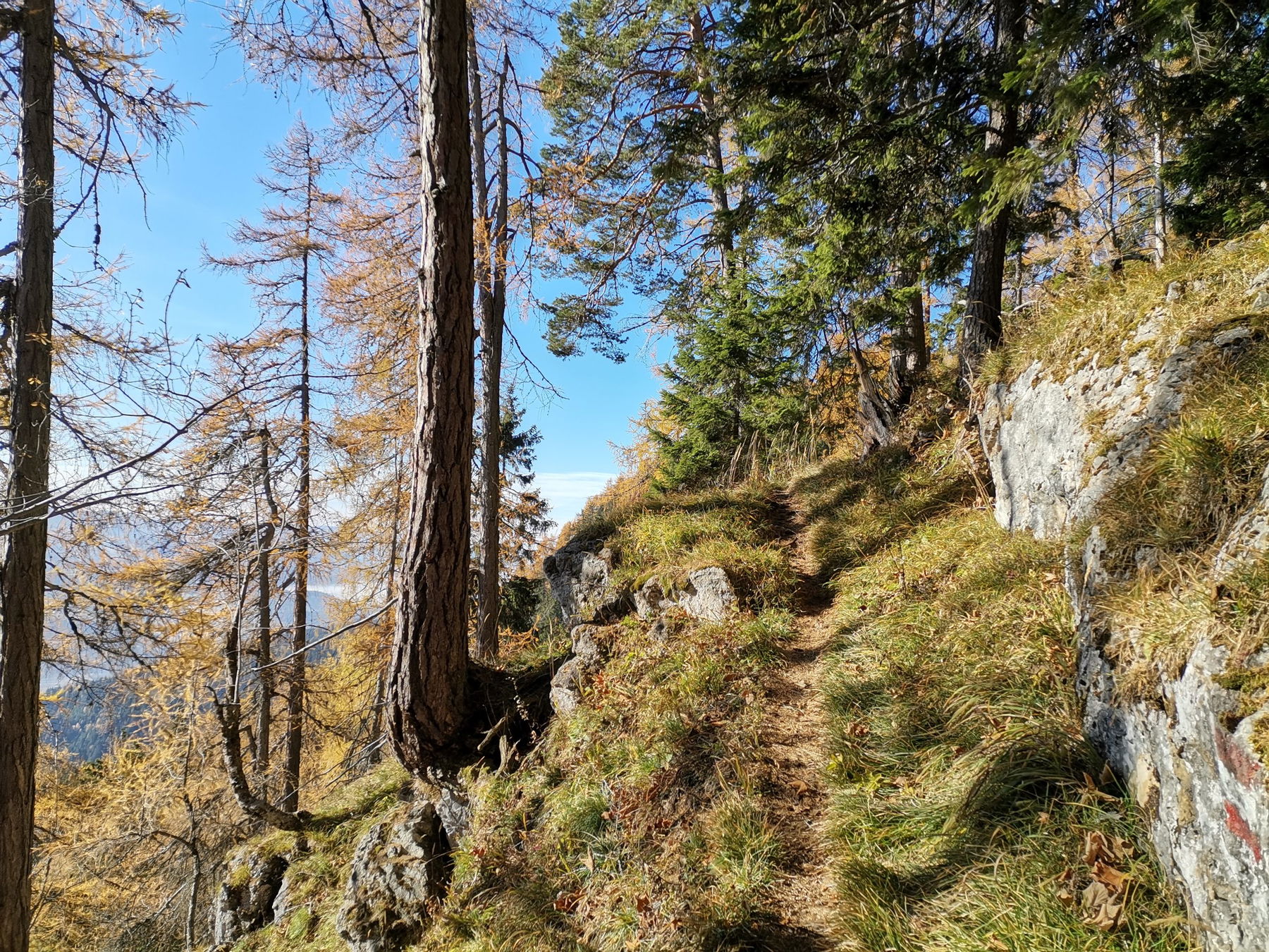 Der lichte Wald ist wunderschön herbstlich eingefärbt, die Lärchen glühen gelb in der Sonne, der knorrige Bergahorn ist schon entlaubt. Das unbeschwerte Dahinschreiten in leichtem Auf und Ab wird kurz unterbrochen von einer Schotterstraße, die durch einen riesigen Windbruch führt. Eine Tafel informiert über Arbeitsabläufe und die geplante Aufforstung.