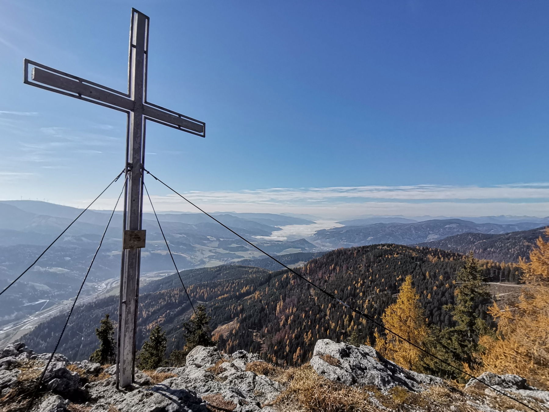 Die erste Steilstufe führt auf die Bärenwand. Von da genieße ich bereits einen schönen Blick ins Mürztal, der Nebel hat sich ja inzwischen verzogen. Weiter auf dem schmalen Pfad durch den höher oben felsdurchsetzen Wald. Die letzten Kehren über den Probststeig bis zur Gipfelwiese wieder steiler.