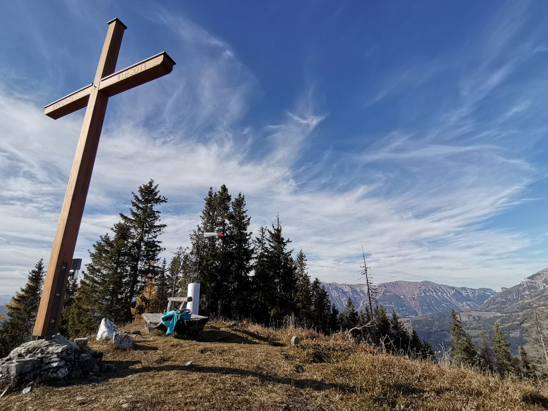 Nach weiteren zwei Stunden und einem kurzen Besuch am Gipfel der Großen Scheibe sitze ich auf der windgeschützten Terrasse der Scheibenhütte und lasse mir Gemüsesuppe und Radler schmecken. Ein netter Plausch mit dem Sitznachbarn und dem freundlichen Hüttenwirt Hans runden die Sache sehr angenehm ab. Die Scheibenhütte ist immer einen Besuch wert. Sie ist auch im Winter an den Wochenenden geöffnet. Man kann auch von Kapellen oder direkt von Mürzzuschlag hinauf.