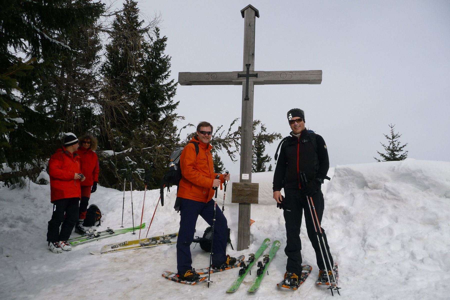 Die 750 HM auf den Gipfel legen wir in 2:30 h zurück. Nett ist es, wenn man aus dem Wald heraus die Kaarlhütte in der Sonne sieht – dann weiß man, dass es danach nur mehr 100 (steile) HM zum Gipfelkreuz sind. Vom Gipfel runter haben wir ein bisschen Spaß im Schnee und laufen mit den Schneeschuhen bergab. In dem patzigen Schnee scheitern meine Versuche, mit den Schneeschuhen zu rutschen.