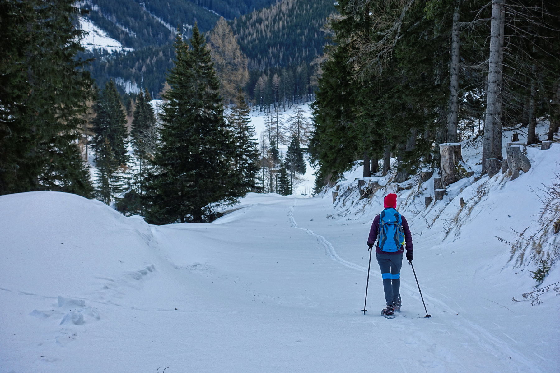Aus irgendeinem Grund finde ich aber die Idee im Wald, im Schnee, in den 24. Dezember zu starten unattraktiv. Ich stehe dazu, dass ich Veronika vorschlage, der Snowmobilspur auf der Forststraße zu folgen.