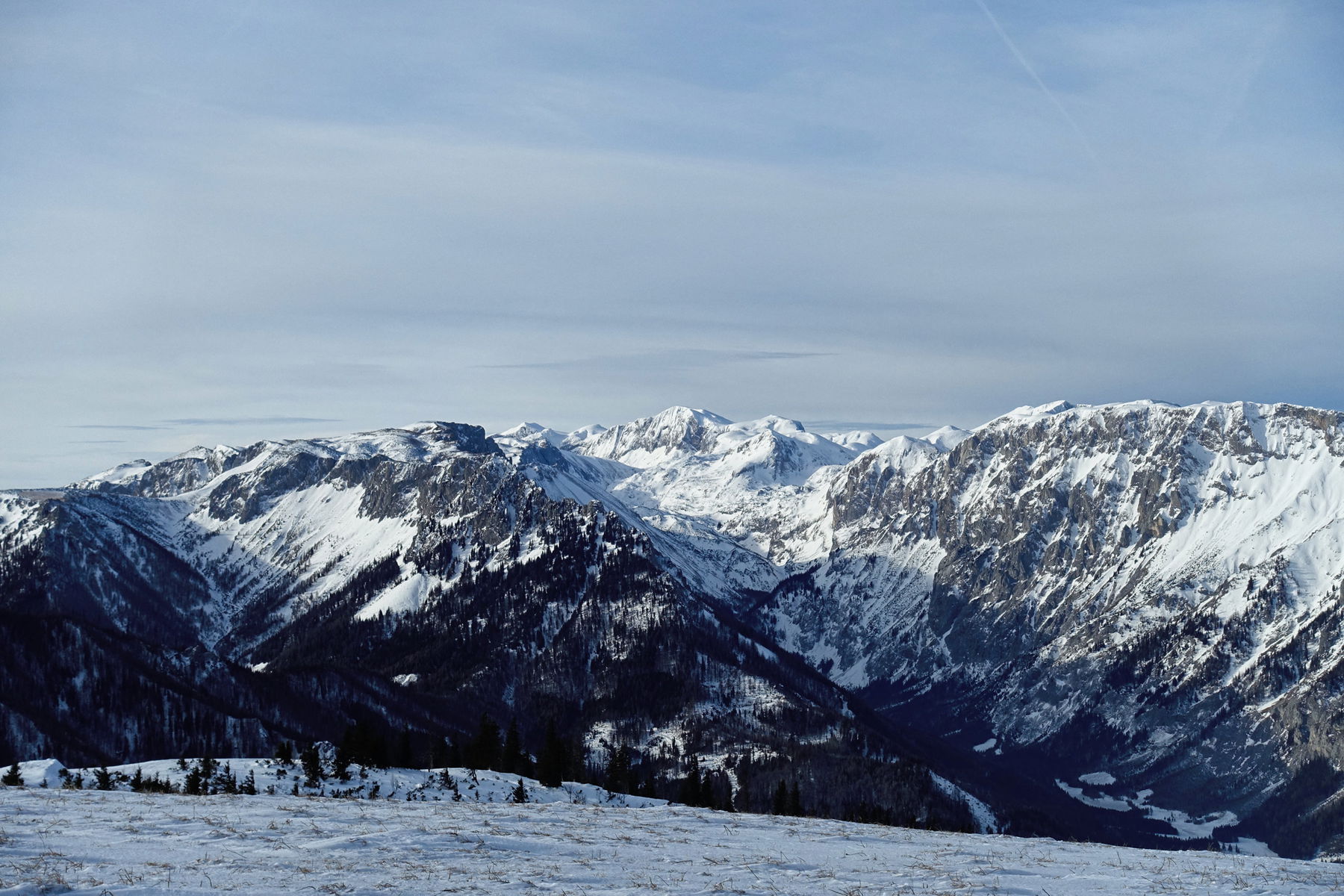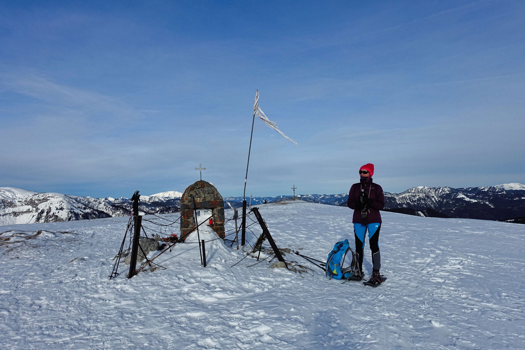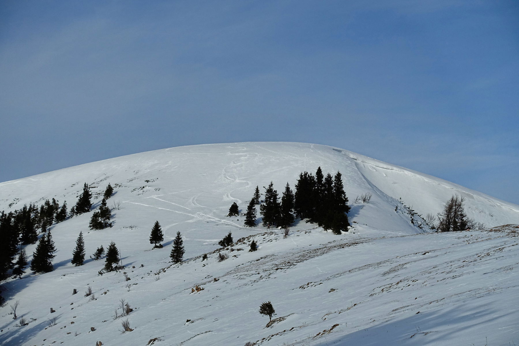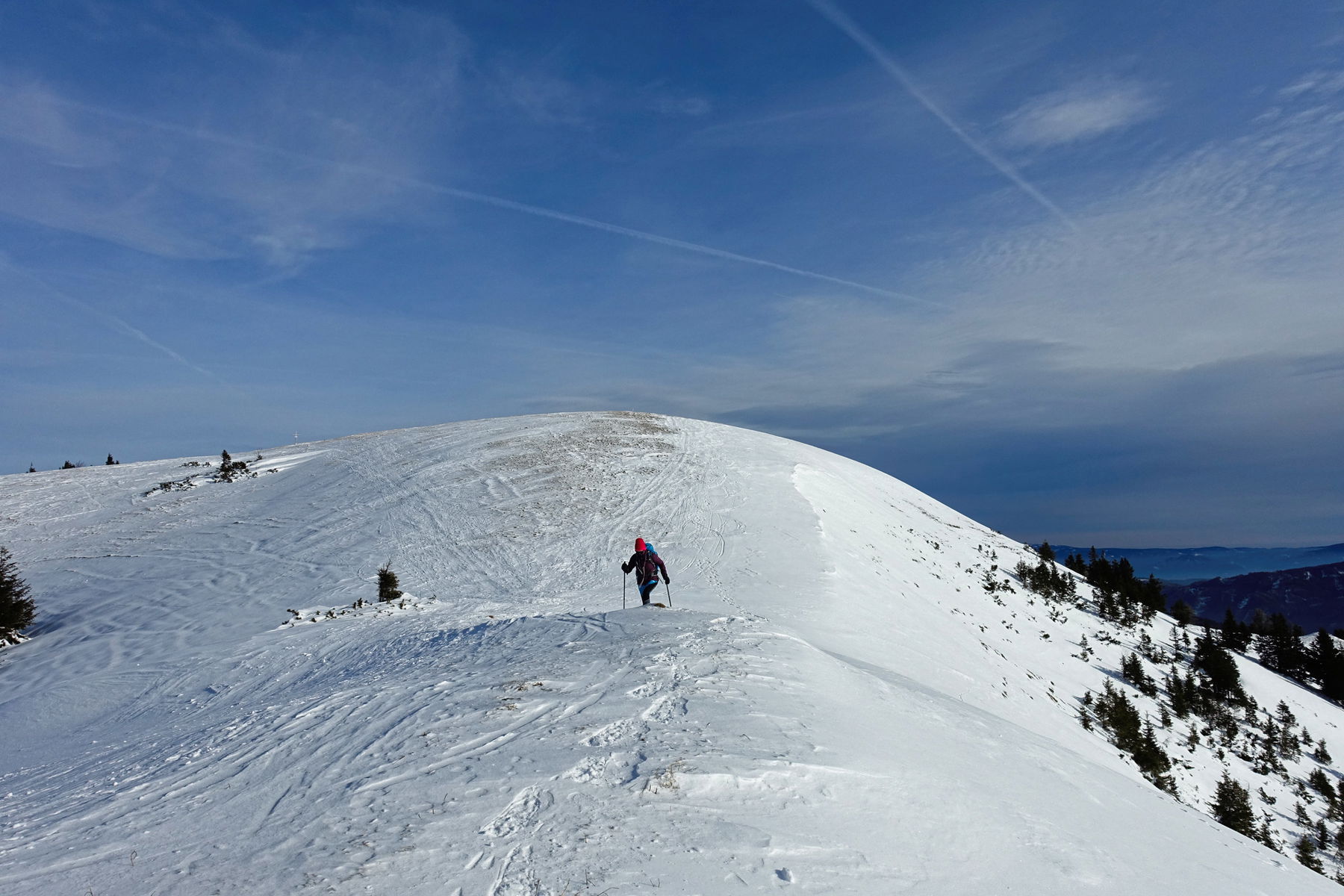 Von der Passhöhe Seeberg bis zum Gipfel herauf ist es eine schöne und einfache Tour mit etwa 600 Höhenmetern – was sie auch noch zu einer einfachen Tour macht. Auch wenn uns am 23. Dezember nicht viele Leute begegnet sind, wissen wir doch aus den Spuren, dass das keine einsame Tour ist. Allerdings führen 99% der Spuren entlang des Aufstiegswegs wieder zurück.