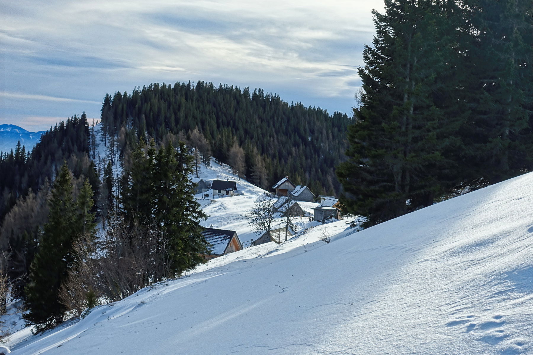 Kurz vor der Göriacheralm gibt es zwei Möglichkeiten: Geradeaus und steil durch den Talschluß zum Sattel hinauf, oder flach und weiter der Forststraße folgend. Beide Wege sind gespurt – mit Schneeschuhen sind auch beide Varianten etwa gleichwertig. Die steile, kurze Version bietet die Gefahr, dass es eisig sein kann. Das stellt für die Zacken auf der Unterseite der Schneeschuhe aber normalerweise kein besonderes Hindernis dar.