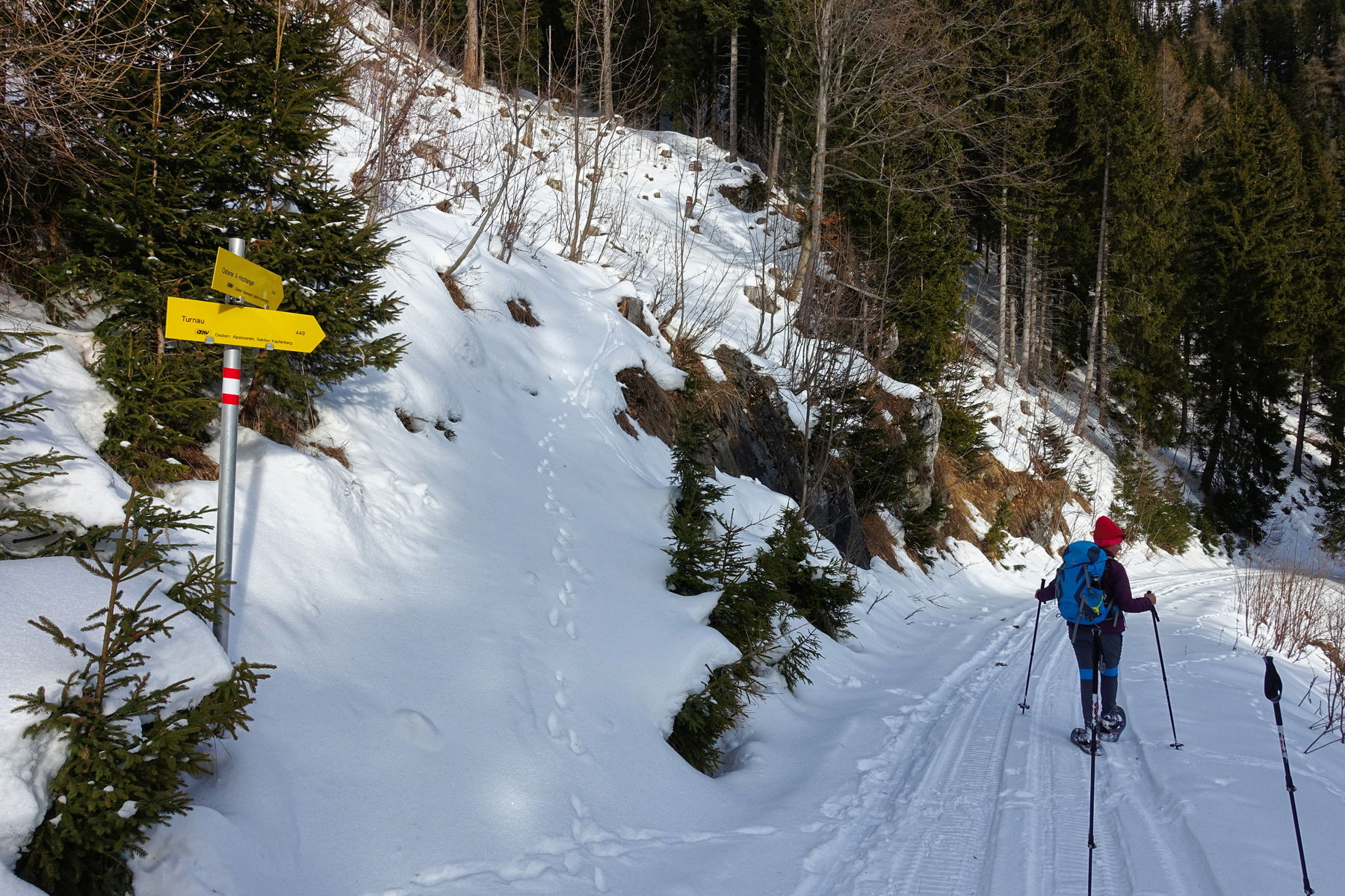 Ab hier sind wieder menschliche Spuren eindeutig identifizierbar: Ein Snowmobil ist aus dem Tal herauf und wieder hinunter gefahren. Die beiden Wanderwege nach Turnau sind mittels Tafeln und rot-weiß-roten Markierungen am südlichen Ende der Osteralm gut markiert – allerdings ungespurt.