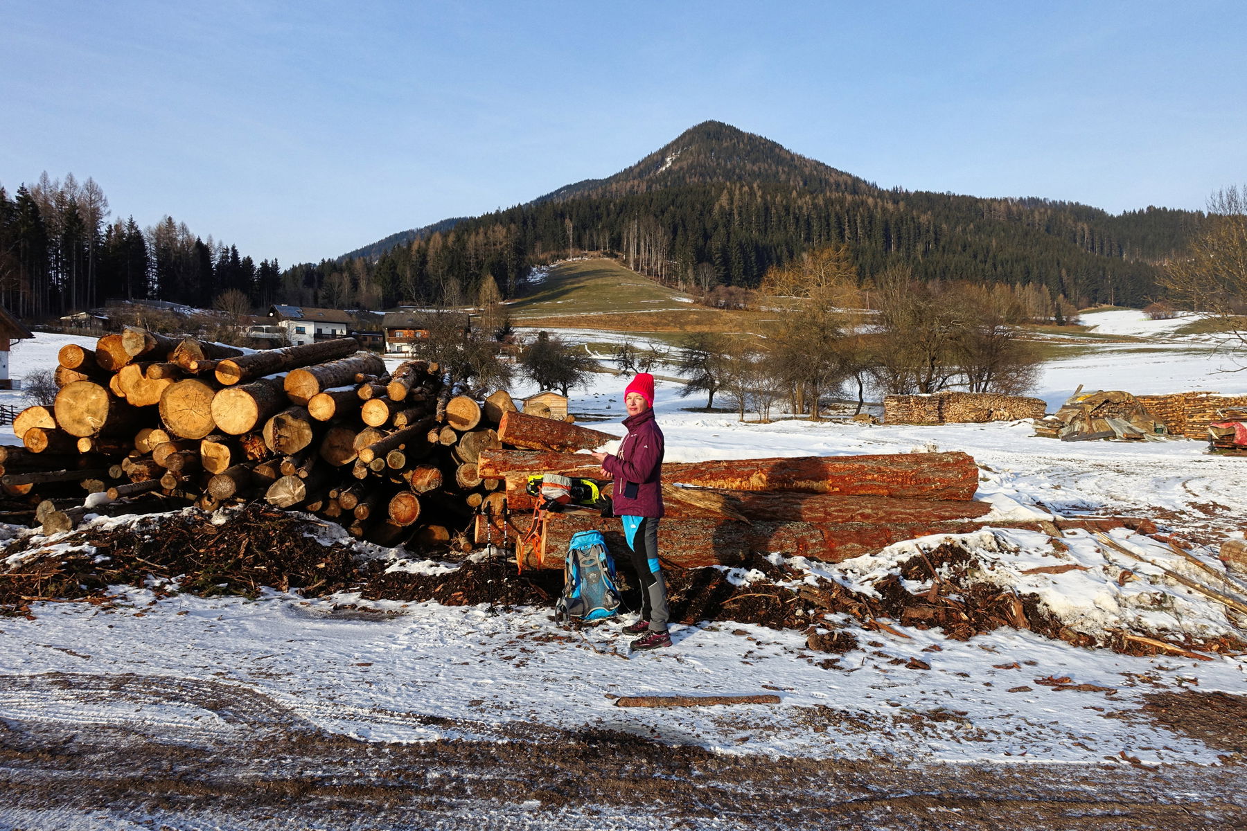 Würde mehr Schnee liegen, würde ich der Forststraße so lange weiter folgen, bis sie bei der zweiten Kreuzung nach unten führt – zwei Kehren weiter und man steht in Eichholz, zwischen Gehöften. Von dort direkt nach Turnau hinunter, um am Hauptplatz in den Bus einzusteigen.