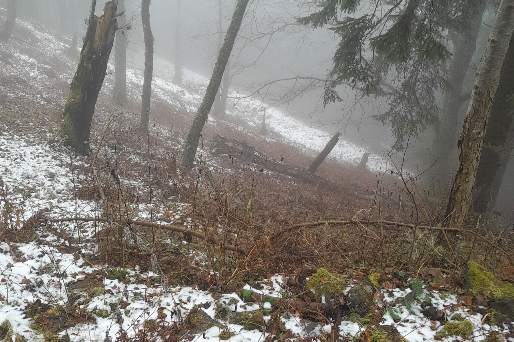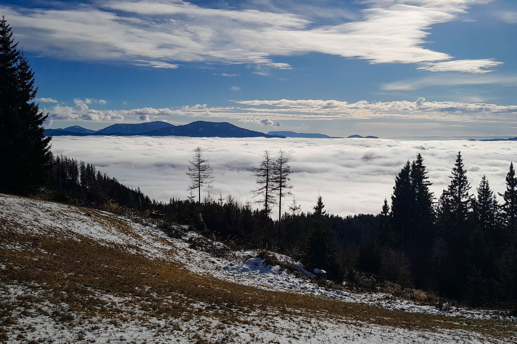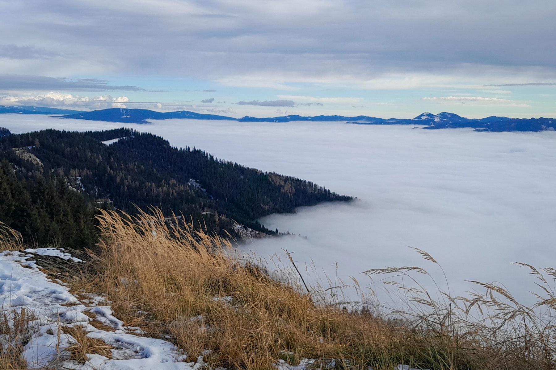 Zunächst steigen wir wieder bis zum Bründlweg ab und tauchen langsam in die Nebelschicht ab, die über dem Mürztal liegt.