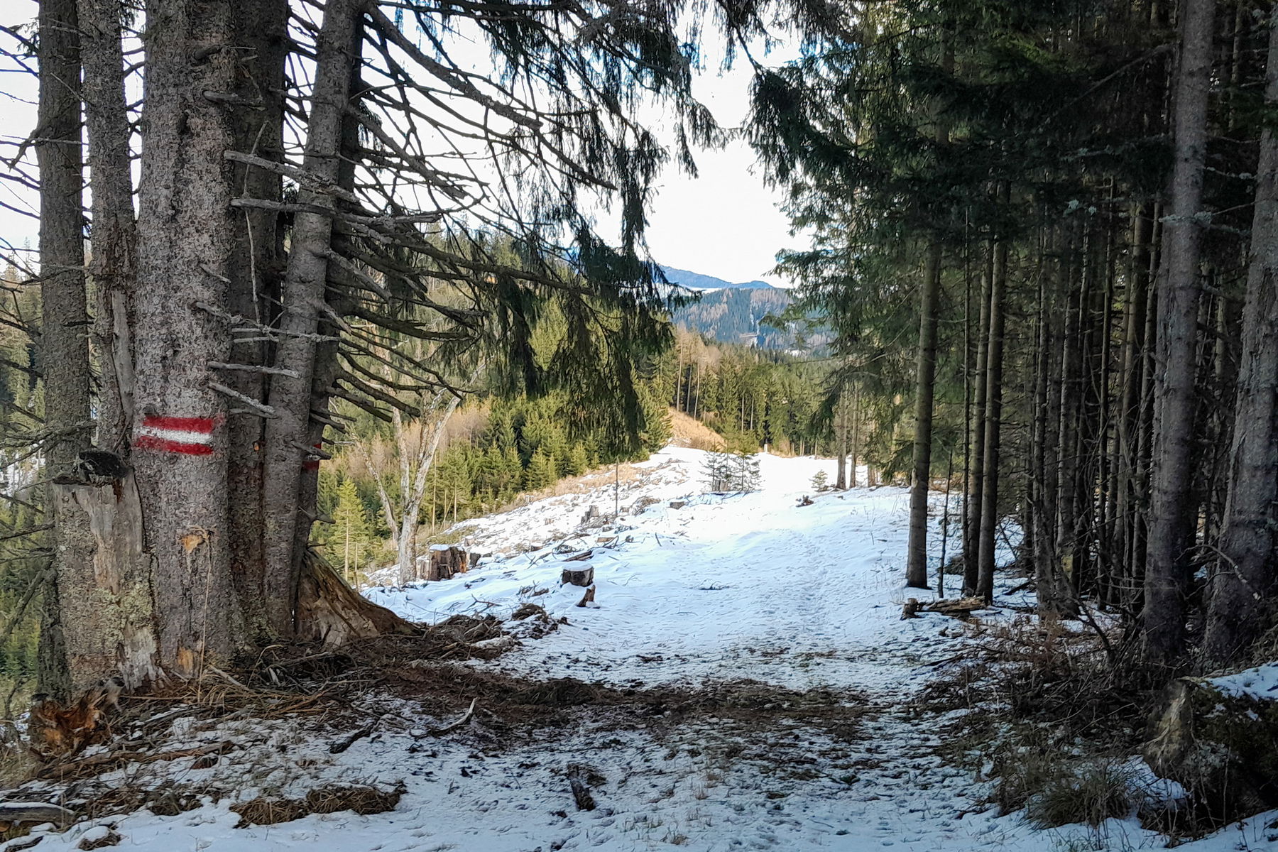 Für etwa 2 Kilometer folgen wir der Forststraße, die aufgrund der Nordlage schneebedeckt ist, allerdings müssen wir nach ca. 600 Metern feststellen, dass die Forststraße auf einmal endet und wie sich herausstellt ungefähr 20 Höhenmeter oberhalb weitergeht.