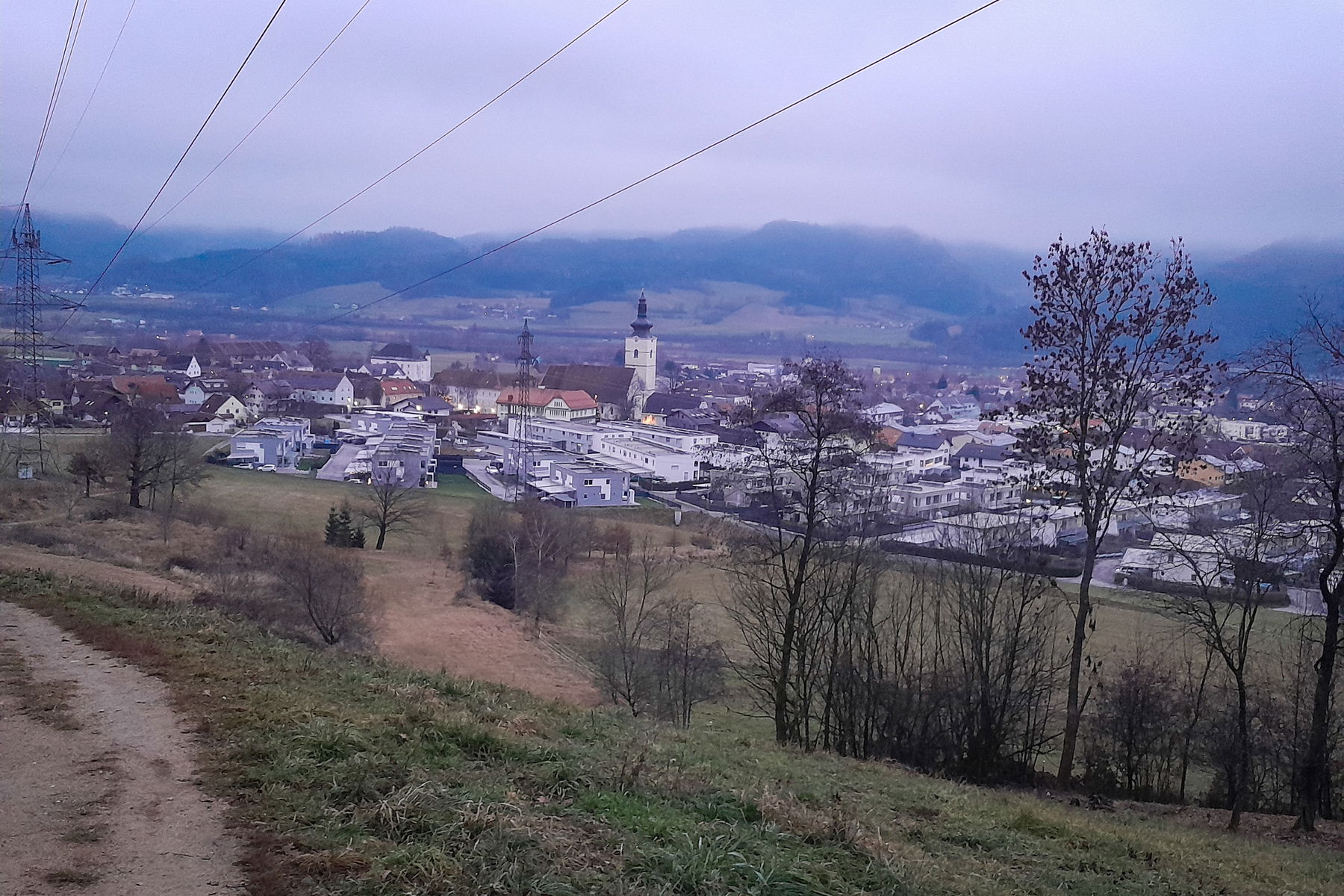 Nach weiteren 2 Kilometern bergab erreichen wir den Ortsrand von St. Lorenzen im Mürztal, rechtzeitig, jetzt wird es langsam dunkel. Vorbei an der Pfarrkirche von St. Lorenzen folgen wir der L123 (Stollinggrabenstraße) bis St. Marein im Mürztal, queren die L118 (Semmering Begleitstraße) und erreichen über die Bahnhofstraße den Bahnhof von St. Marein – St. Lorenzen.