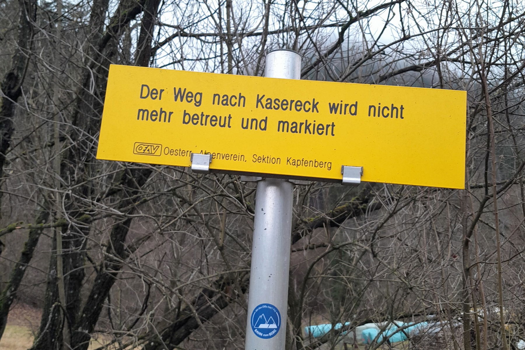 Hier sollte eigendlich der markierte Weg beginnen, doch ein Hinweisschild des Alpenvereines Sektion Kapfenberg informiert das der Weg nach Kasereck nicht mehr betreut und markiert wird.