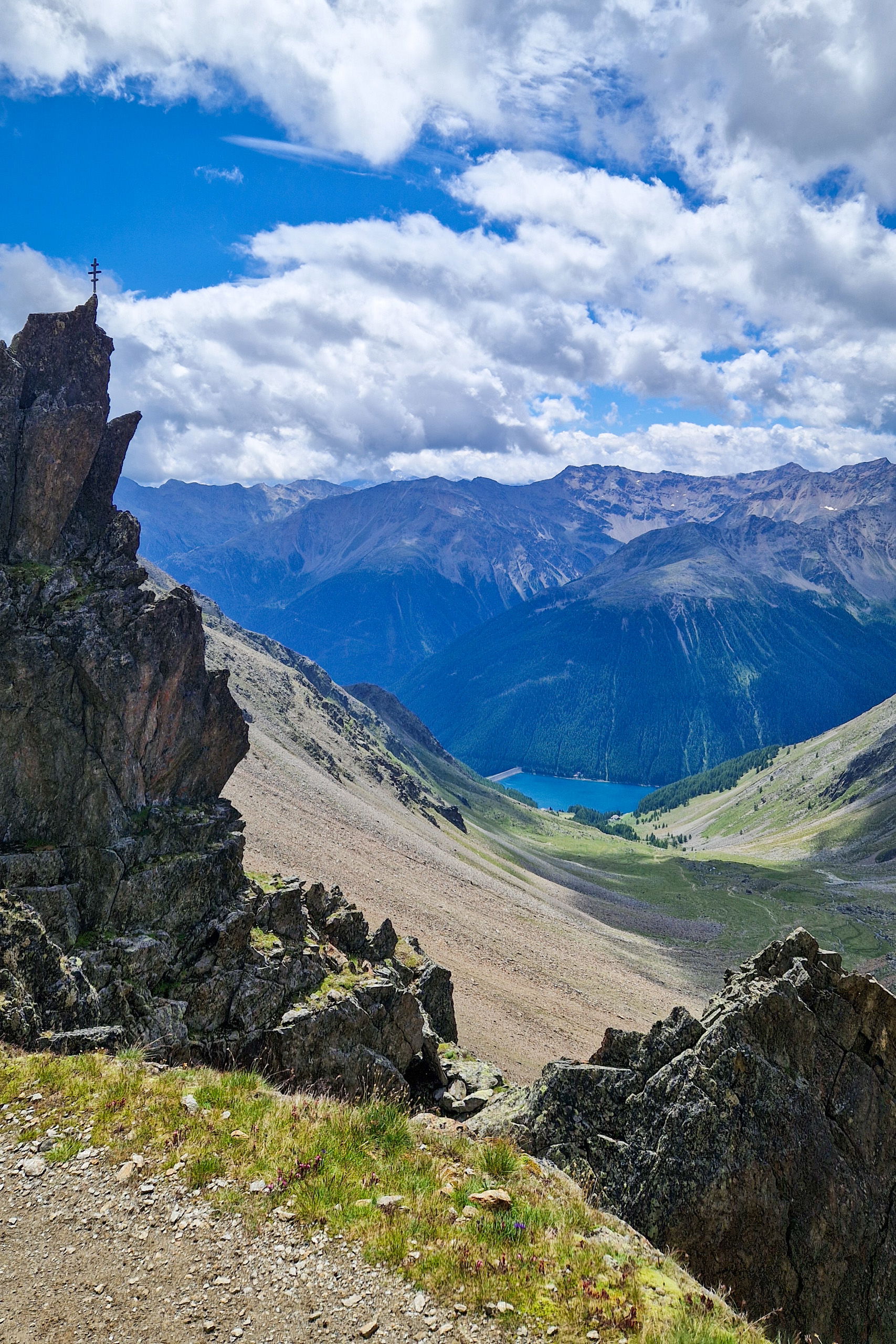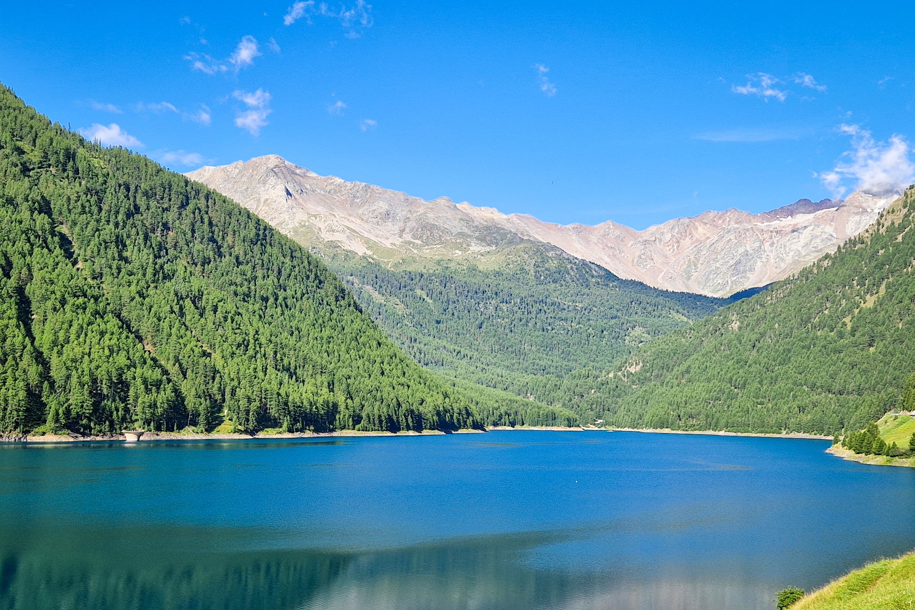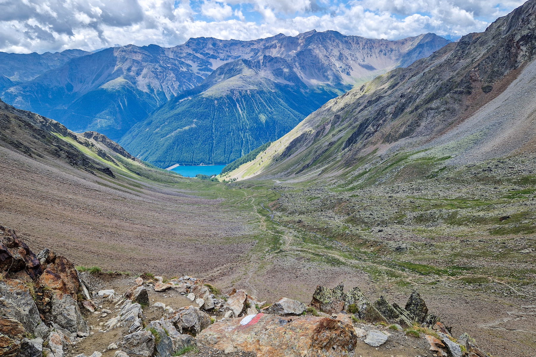 Du startest in München mit dem RailJet der ÖBB nach Italien. Die Züge sind stark ausgelastet, daher bitte immer reservieren. Nimm den ersten in der Früh um halb acht. Mit Umstieg in Bozen erreichst du Meran um 12:13 Uhr. Ab Meran brauchst du einen Bus. Am besten installierst du die App suedtirolmobil, die sagt dir, dass der Bus 261 dich direkt nach Vernagt bringt: 12:36 ab, 13:51 an. Direkt am Stausee auf rund 1.700 Metern Seehöhe steigst du aus.