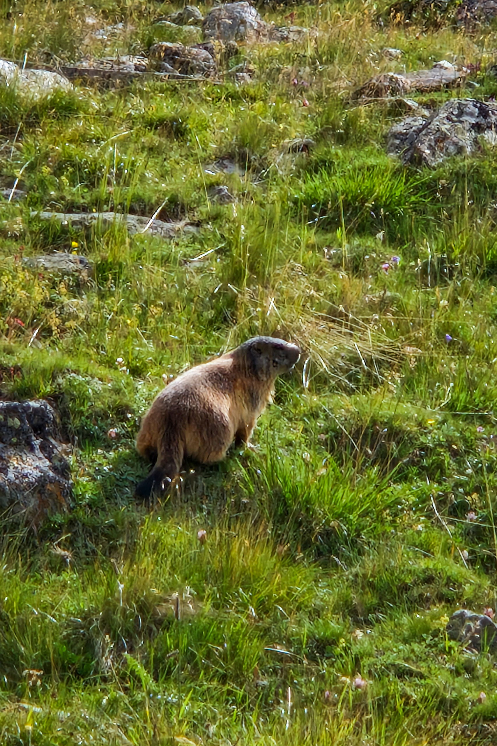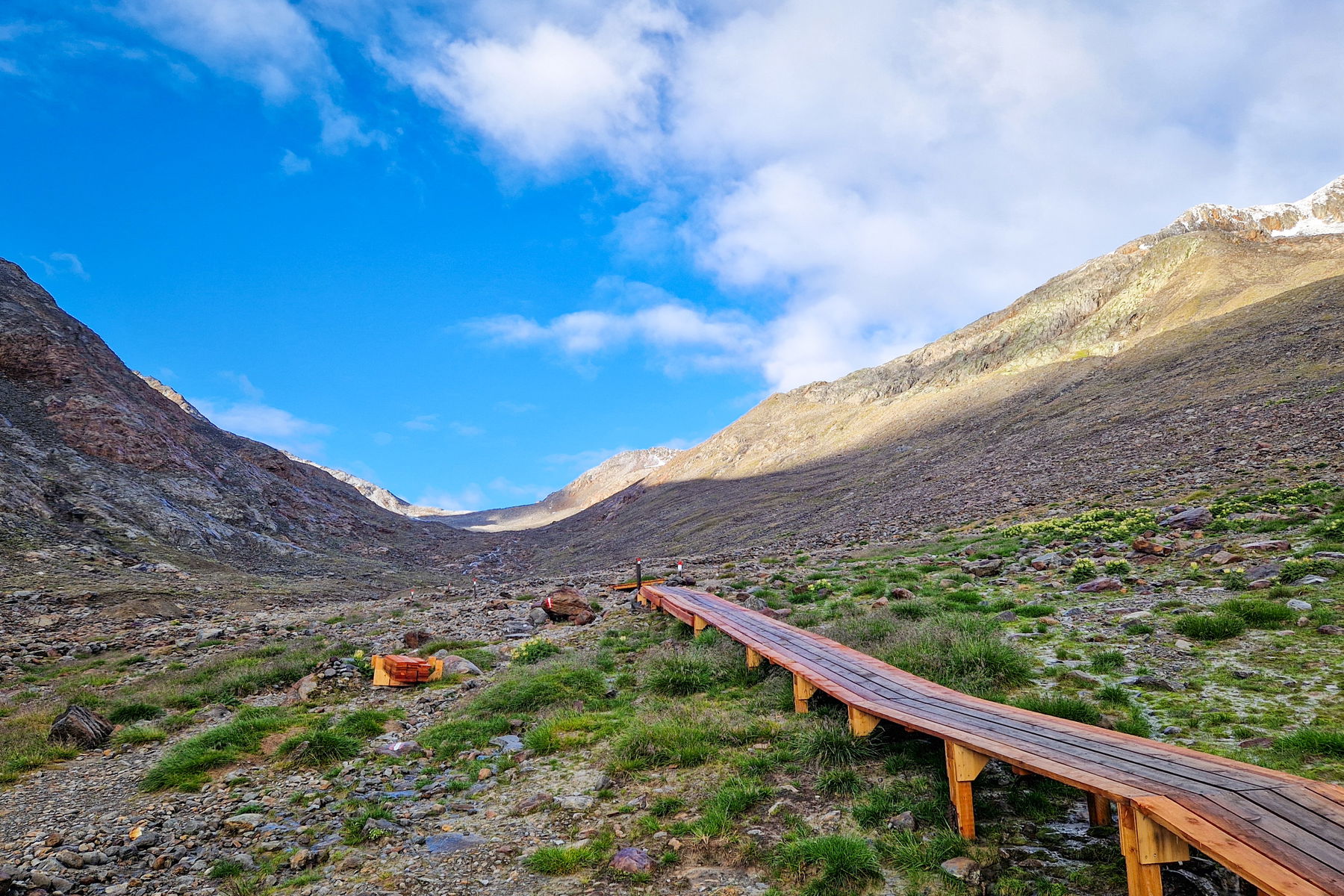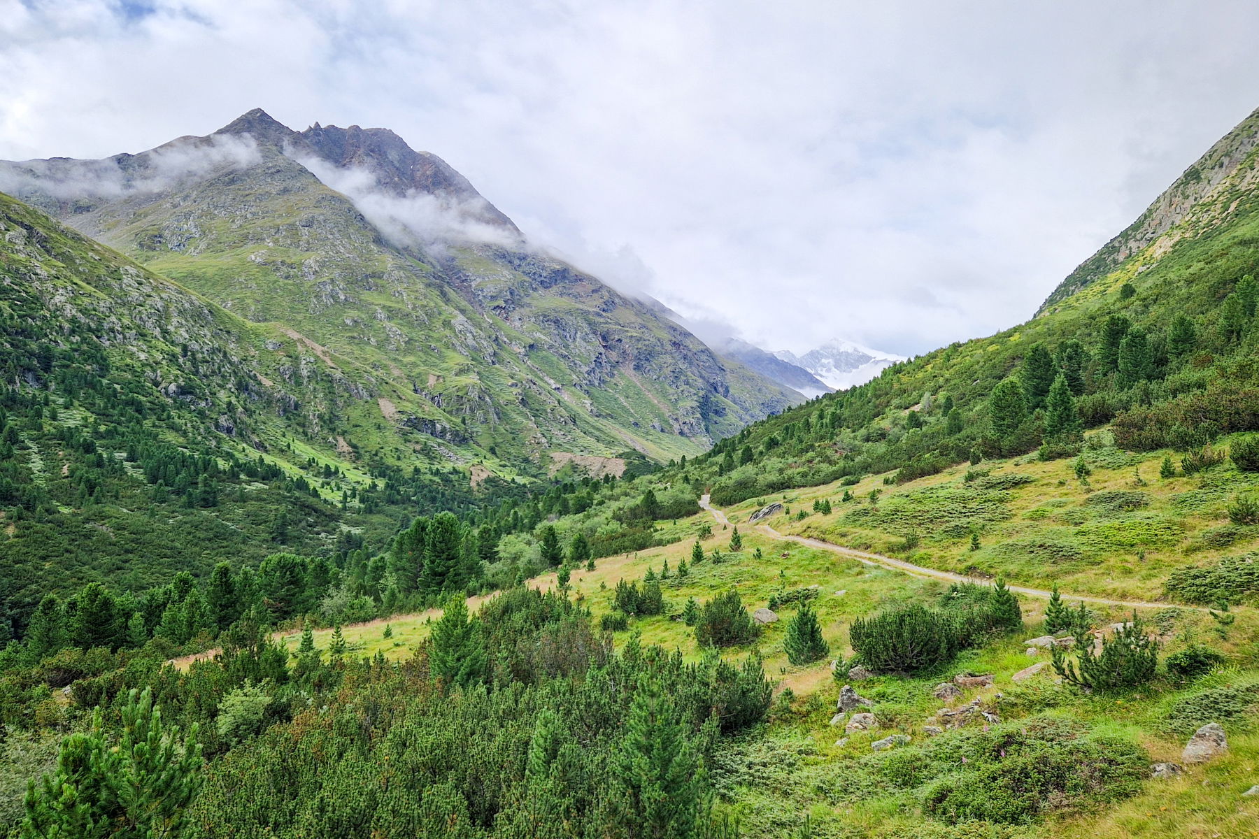 Durch lockeren Lärchenwald und beweidete Wiesen steigt der Weg gleichmäßig und zügig bergan, quert zweimal einen Bach, bis die Vegetation immer karger wird und schließlich nur noch aus Geröll besteht.