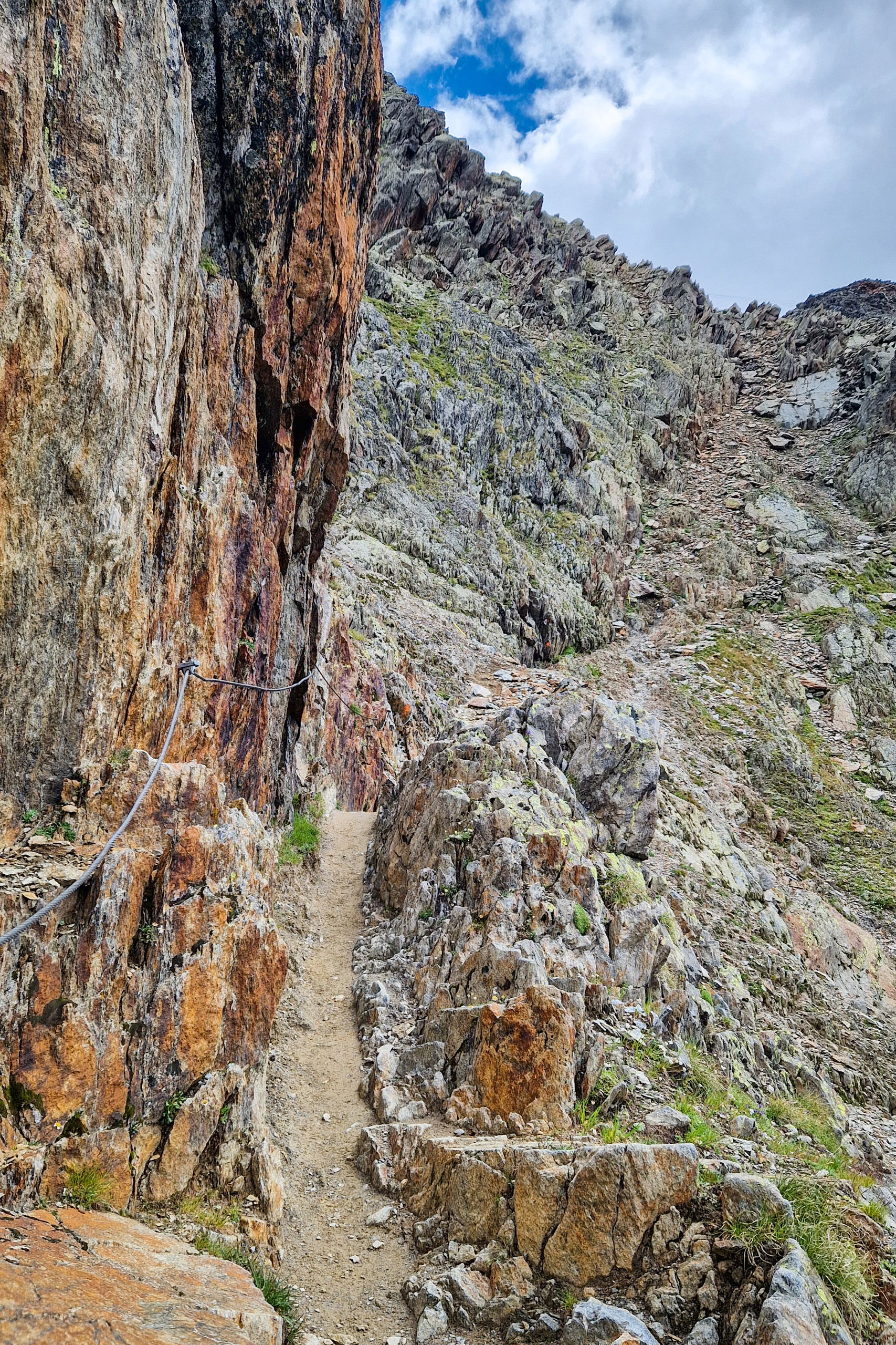 Rechts oben siehst du schon einen Masten der Materialseilbahn, dort ist dann auch die Hütte. Vorher hast du aber noch ein letztes Stück Weg am Fels, einmal auch seilversichert aber wirklich nicht problematisch. Trittsicherheit und Schwindelfreiheit sind im Hochgebirge natürlich immer Voraussetzung. Der Aufstieg dauert mit seinen rund 1.300 Höhenmetern 3-4 Stunden Gehzeit.